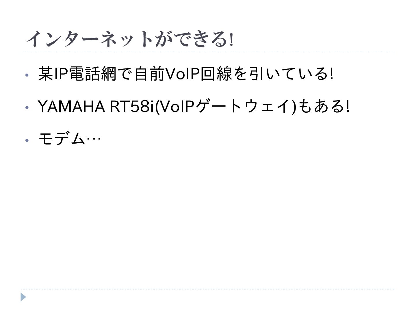 インターネットができる! • 某IP電話網で自前VoIP回線を引いている! • YAMAHA RT58i(VoIPゲートウェイ)もある! • モデム…