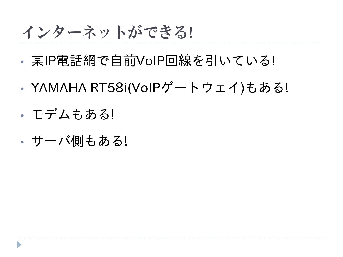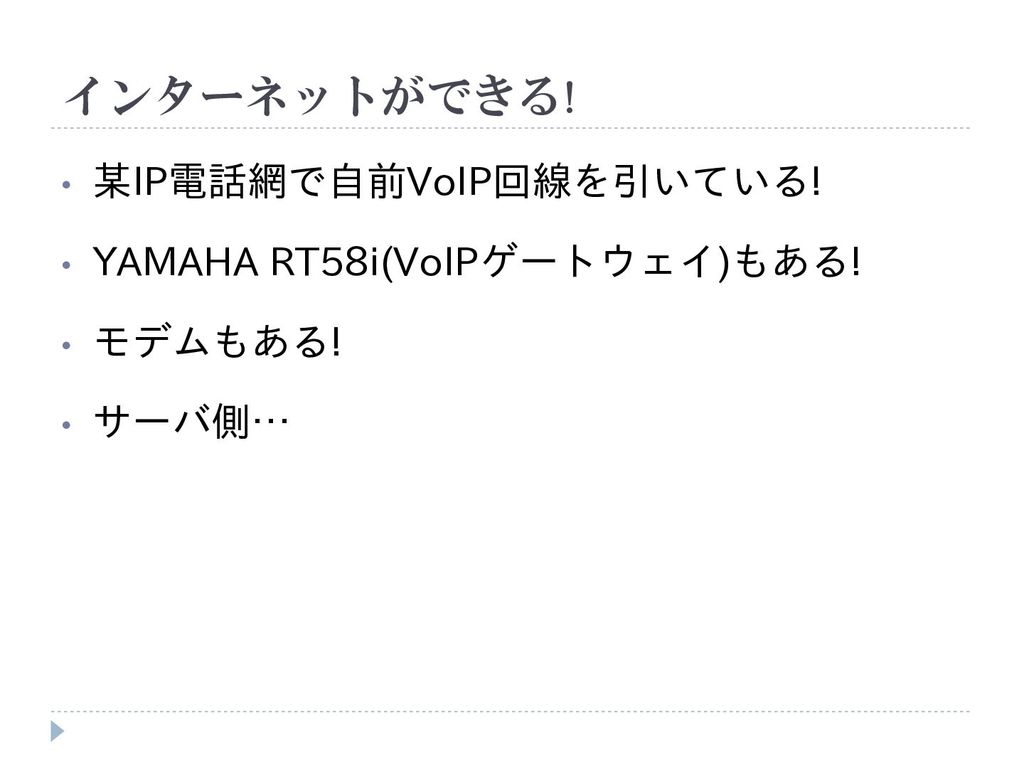 インターネットができる! • 某IP電話網で自前VoIP回線を引いている! • YAMAHA RT58i(VoIPゲートウェイ)もある! • モデムもある! • サーバ側…