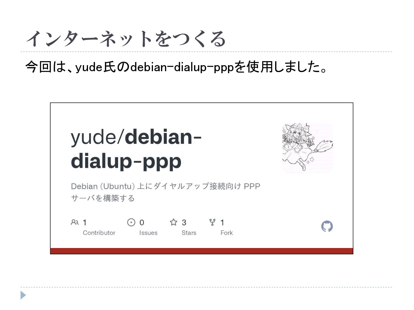 インターネットをつくる 今回は、yude氏のdebian-dialup-pppを使用しました。