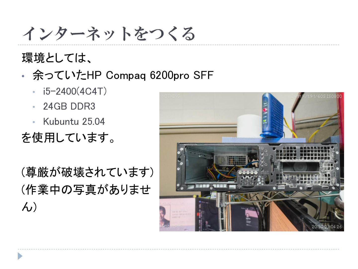 インターネットをつくる 環境としては、 • 余っていたHP Compaq 6200pro SFF • i5-2400(4C4T) •
