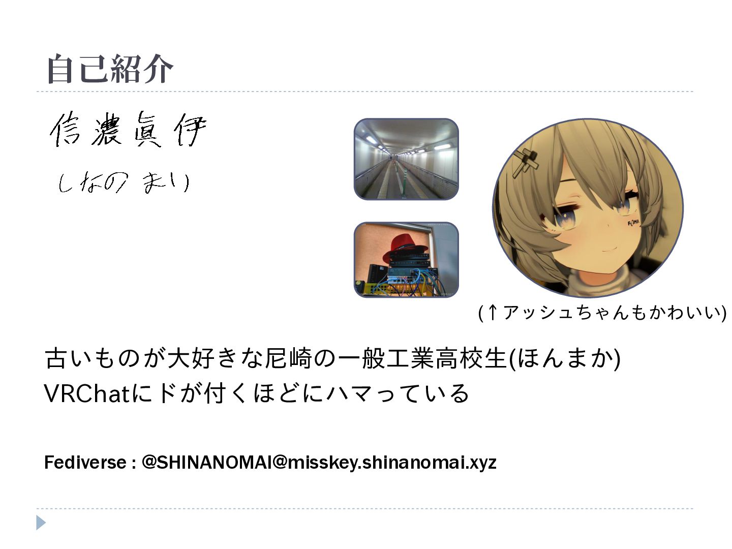 自己紹介 古いものが大好きな尼崎の一般工業高校生(ほんまか) VRChatにドが付くほどにハマっている Fediverse : @