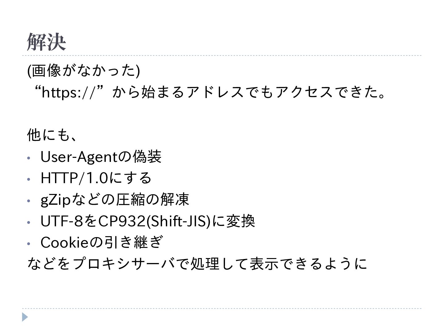 解決 (画像がなかった) “https://”から始まるアドレスでもアクセスできた。 他にも、 • User-Agentの偽装 • HTTP/1.0にする • gZipなどの圧縮の解凍