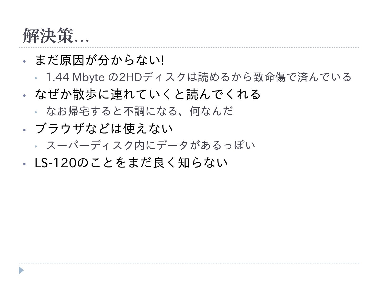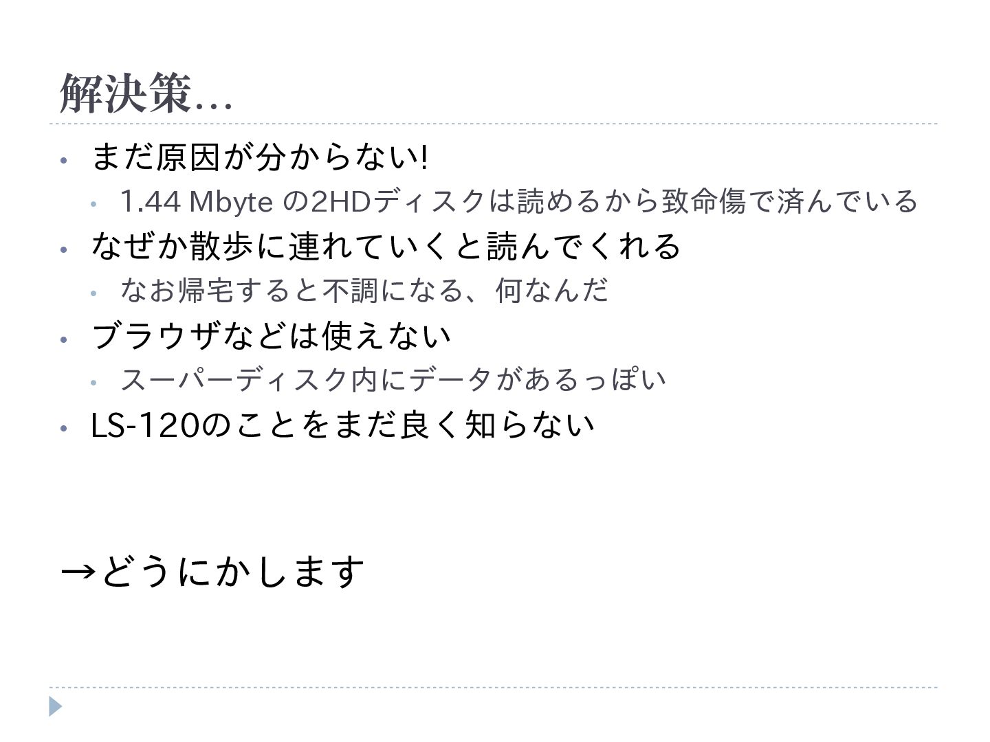 解決策… • まだ原因が分からない! • 1.44 Mbyte の2HDディスクは読めるから致命傷で済んでいる • なぜか散歩に連れていくと読んでくれる •