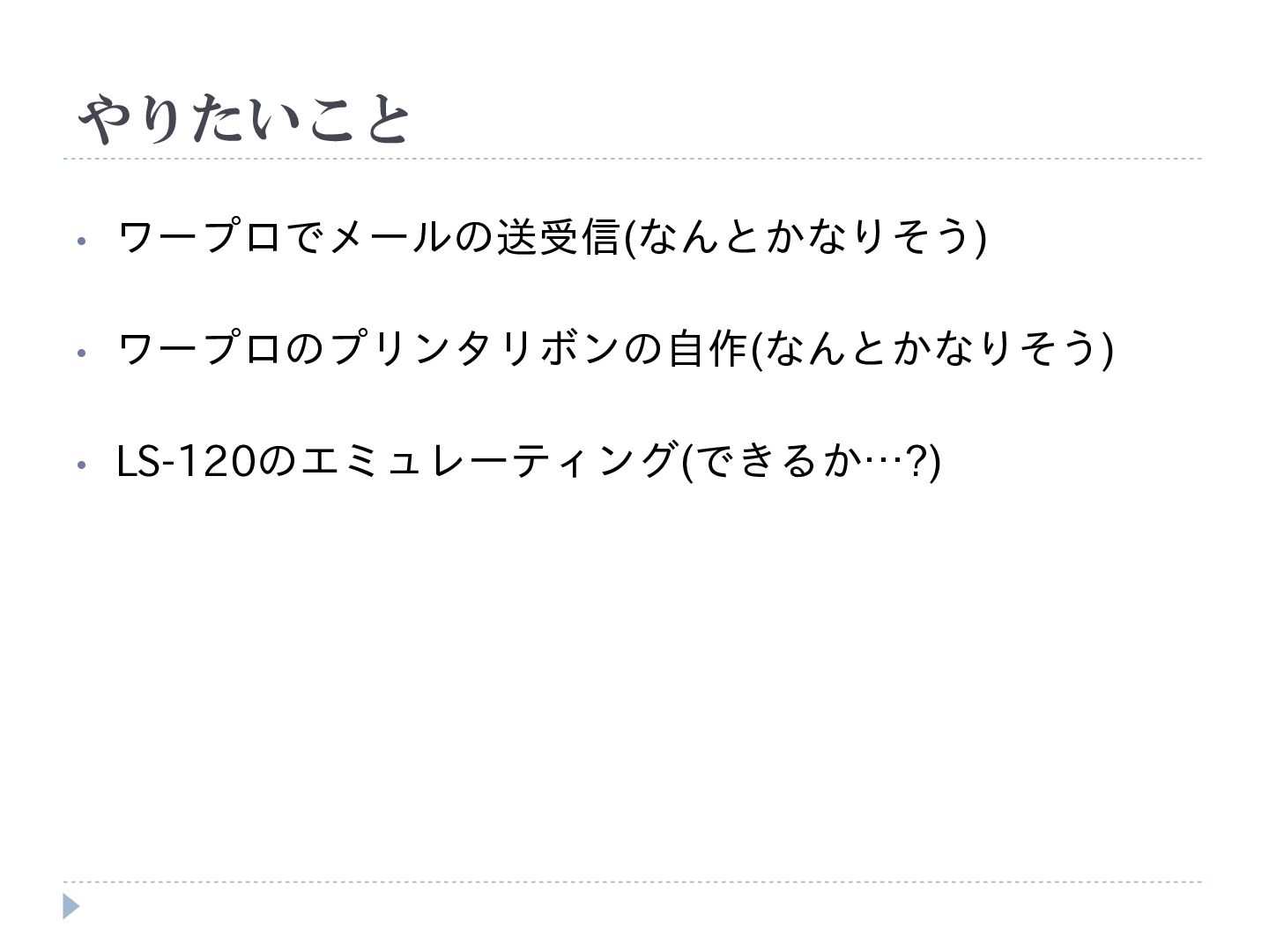 やりたいこと • ワープロでメールの送受信(なんとかなりそう) • ワープロのプリンタリボンの自作(なんとかなりそう) • LS-120のエミュレーティング(できるか…?)