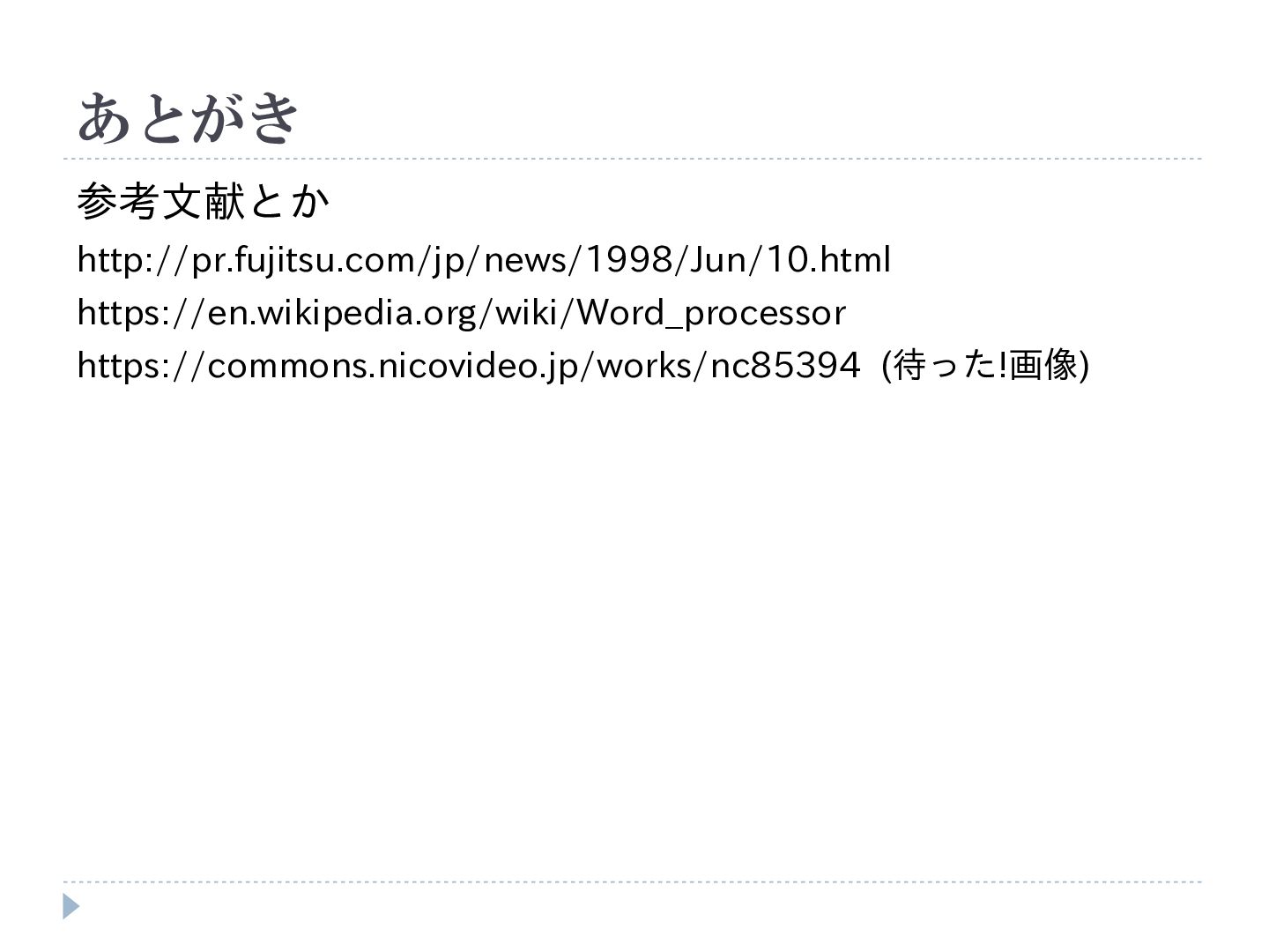 あとがき 参考文献とか http://pr.fujitsu.com/jp/news/1998/Jun/10.html https://en.wikipedia.org/wiki/Word_processor https://commons.nicovideo.jp/works/nc85394 (待った!画像)