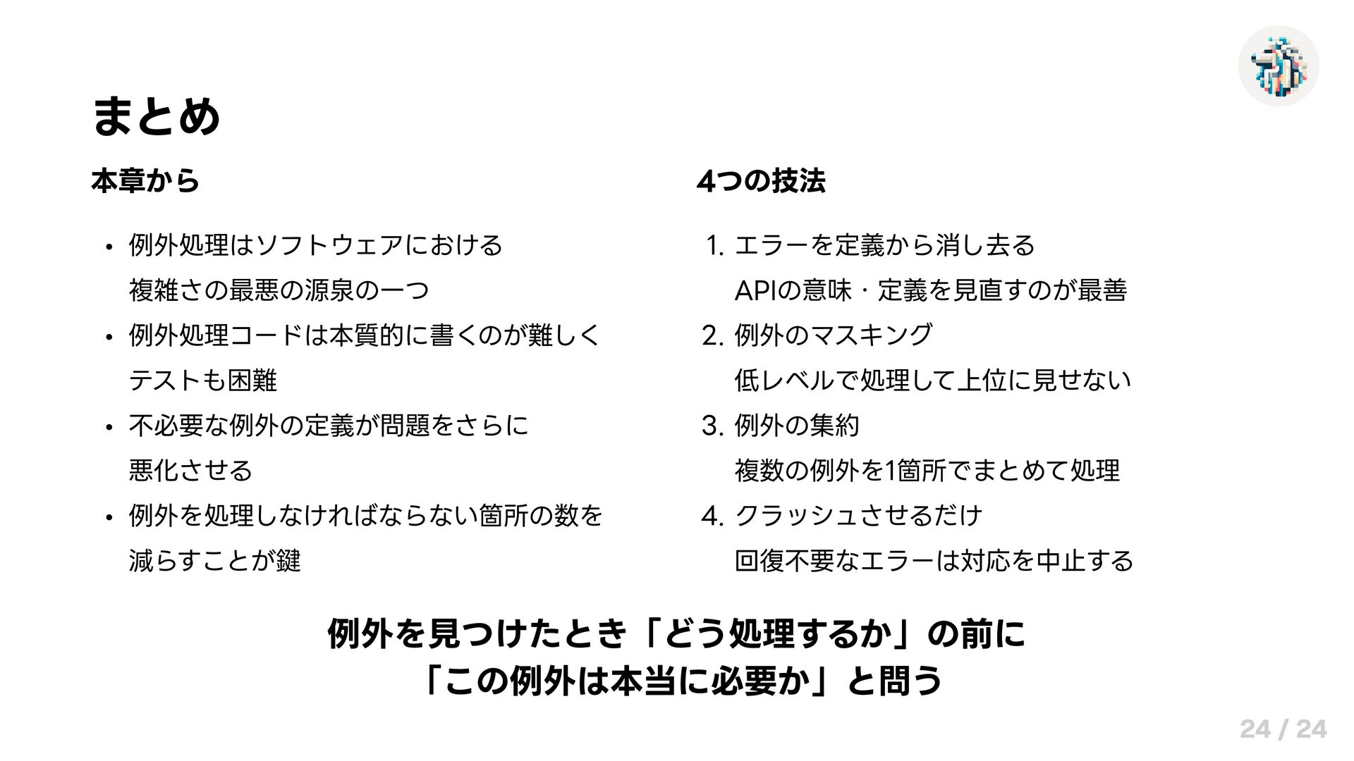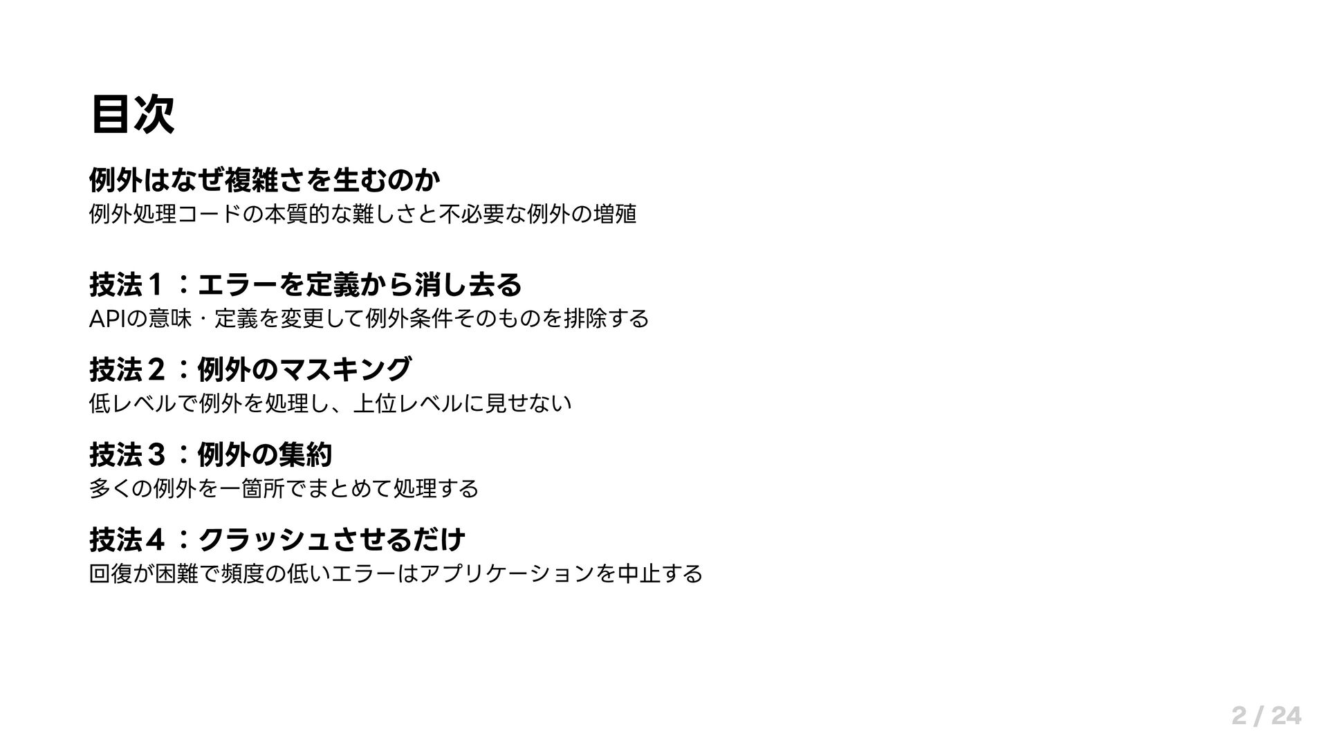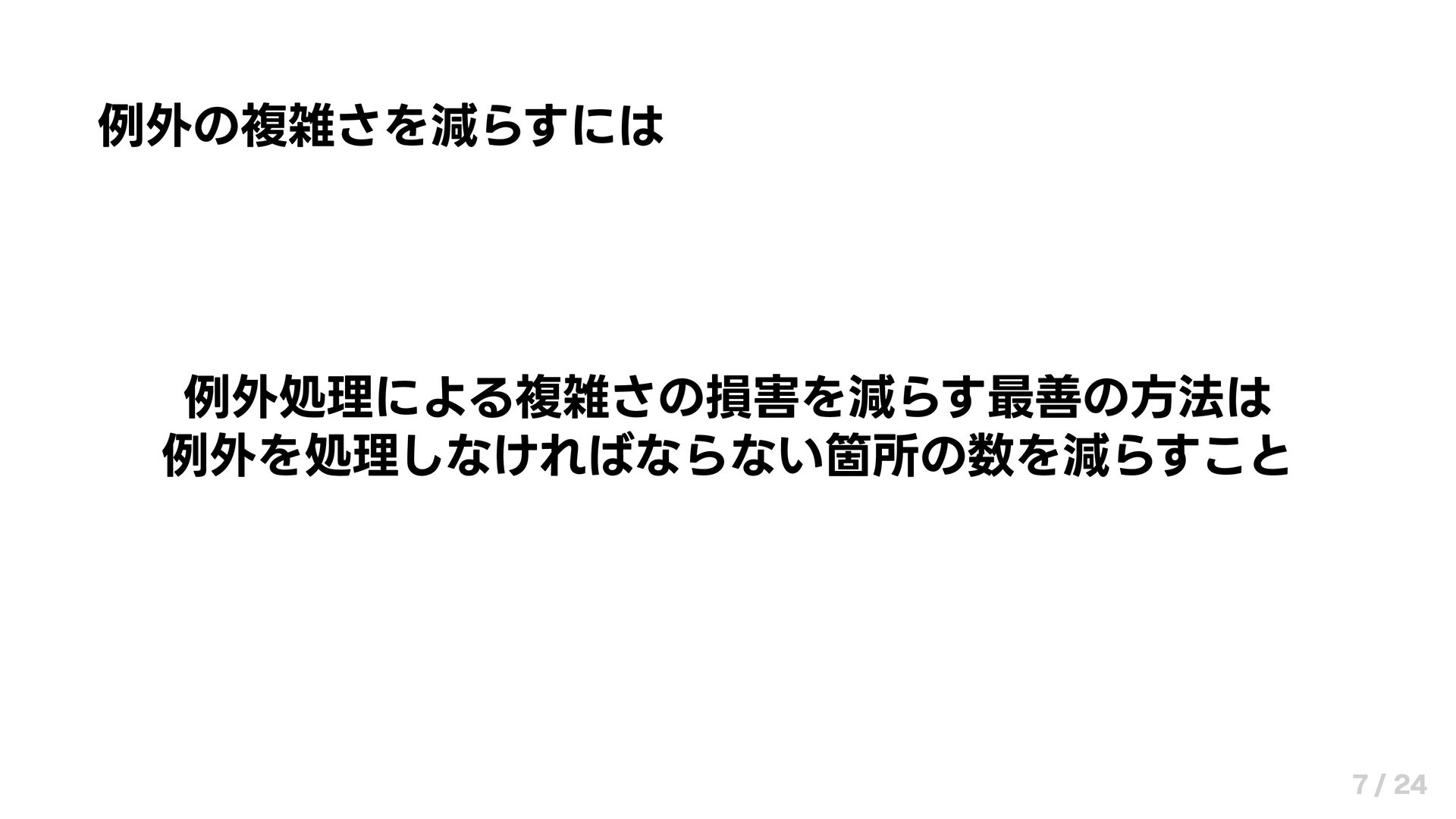 減らすことが鍵 エラーを定義から消し去る APIの意味・定義を見直すのが最善 例外のマスキング 低レベルで処理して上位に見せない 例外の集約 複数の例外を1箇所でまとめて処理 クラッシュさせるだけ 回復不要なエラーは対応を中止する 例外を見つけたとき「どう処理するか」の前に 「この例外は本当に必要か」と問う 24 / 24