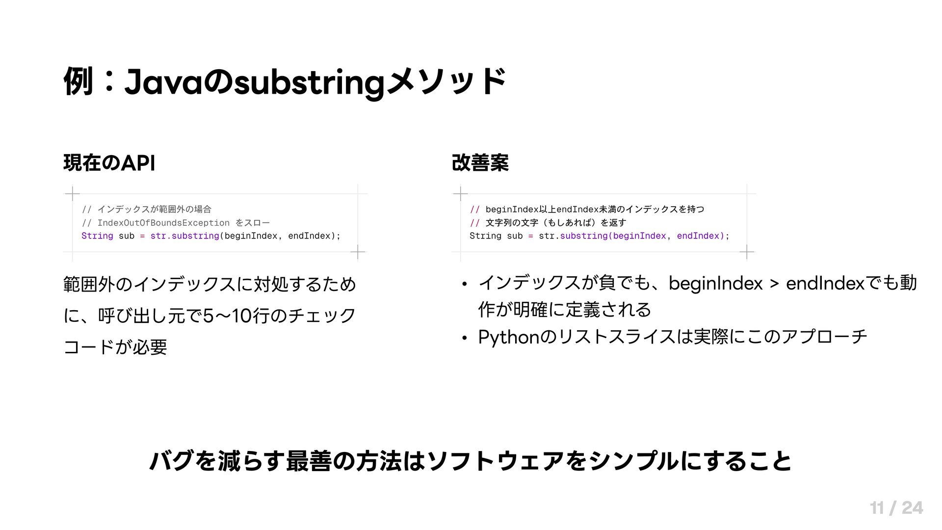 例:Javaのsubstringメソッド 現在のAPI 改善案 範囲外のインデックスに対処するため に、呼び出し元で5〜10行のチェック コードが必要 インデックスが負でも、beginIndex > endIndexでも動 作が明確に定義される