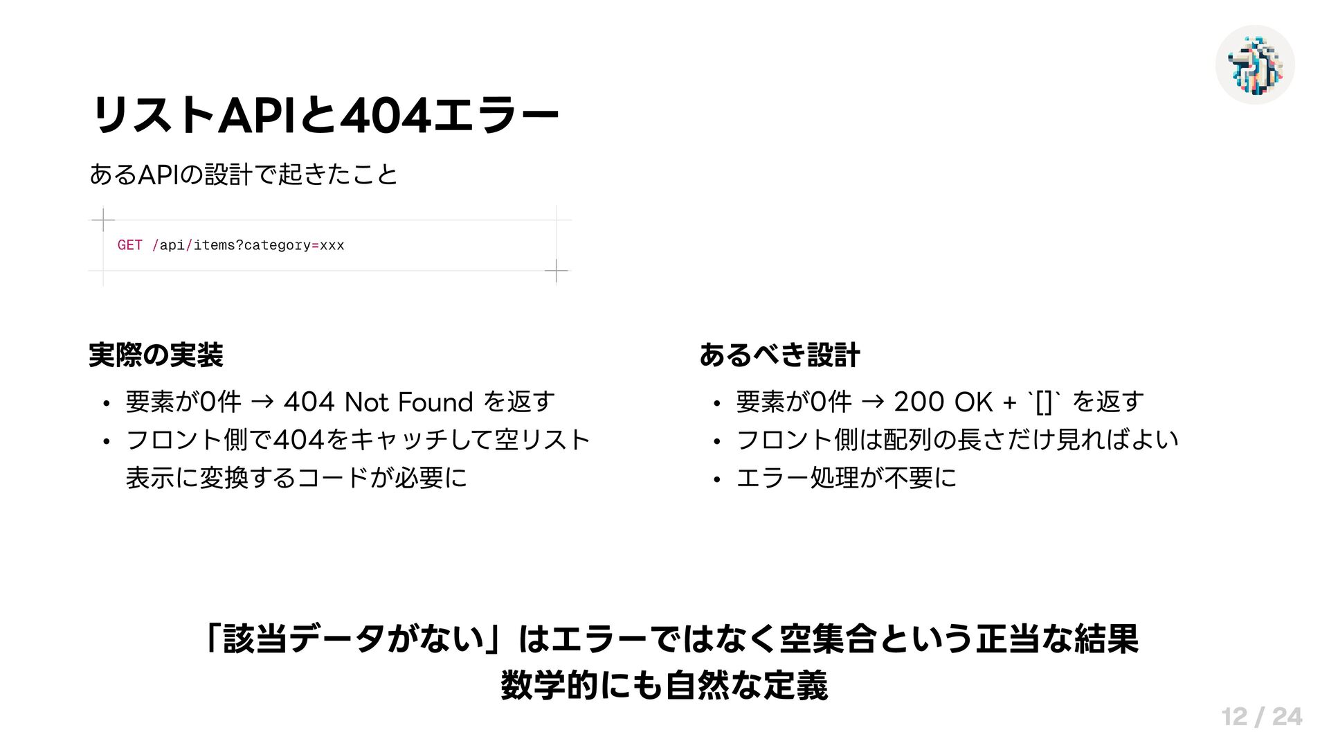 表示に変換するコードが必要に あるべき設計 要素が0件 → 200 OK + `[]` を返す フロント側は配列の長さだけ見ればよい エラー処理が不要に 「該当データがない」はエラーではなく空集合という正当な結果 数学的にも自然な定義 12 / 24