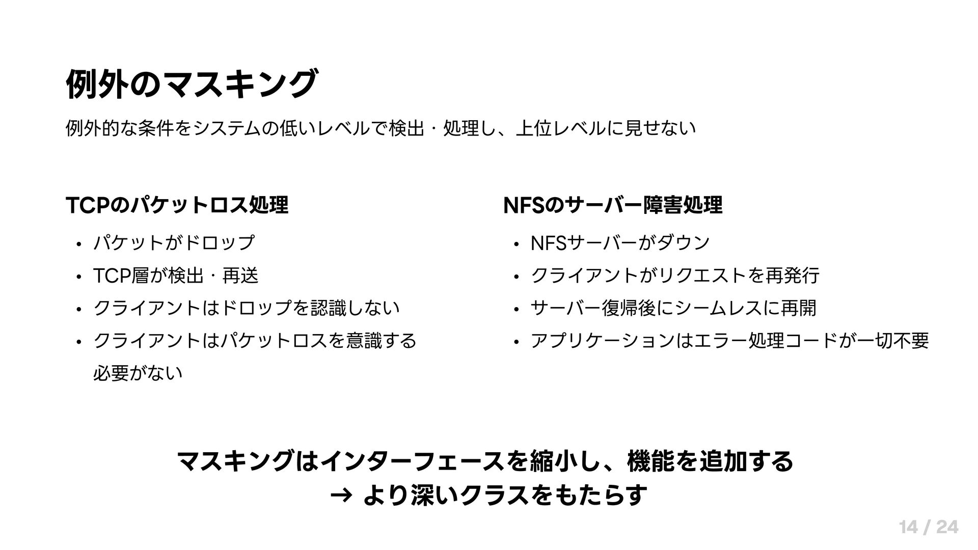 例外のマスキング 例外的な条件をシステムの低いレベルで検出・処理し、上位レベルに見せない TCPのパケットロス処理 パケットがドロップ TCP層が検出・再送 クライアントはドロップを認識しない クライアントはパケットロスを意識する 必要がない NFSのサーバー障害処理 NFSサーバーがダウン