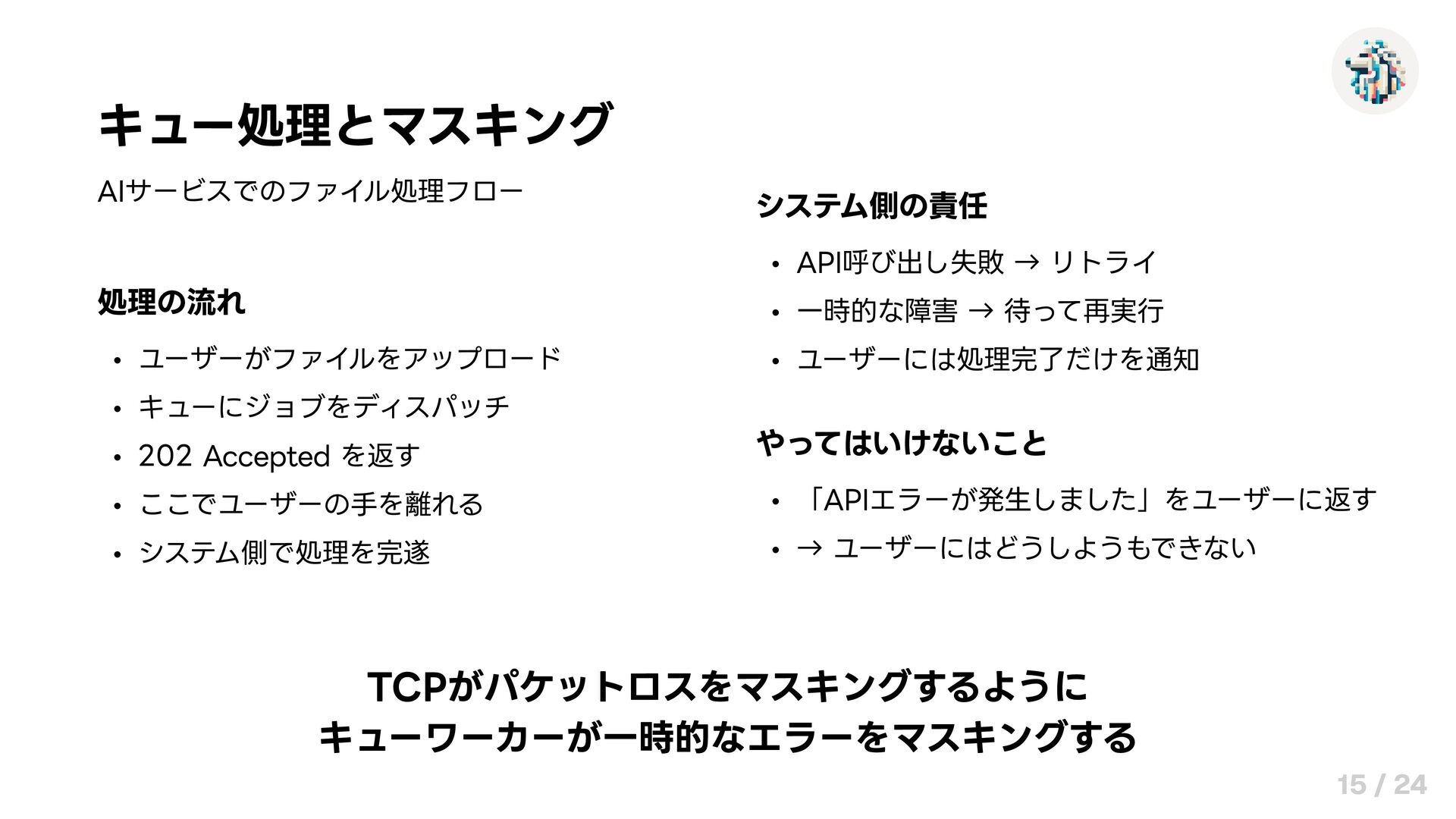 システム側で処理を完遂 API呼び出し失敗 → リトライ 一時的な障害 → 待って再実行 ユーザーには処理完了だけを通知 やってはいけないこと 「APIエラーが発生しました」をユーザーに返す → ユーザーにはどうしようもできない TCPがパケットロスをマスキングするように キューワーカーが一時的なエラーをマスキングする 15 / 24