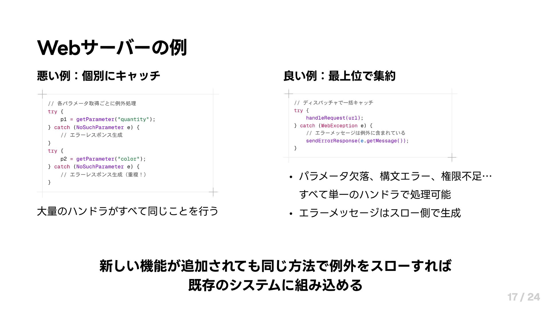 Webサーバーの例 悪い例:個別にキャッチ 良い例:最上位で集約 大量のハンドラがすべて同じことを行う パラメータ欠落、構文エラー、権限不足… すべて単一のハンドラで処理可能 エラーメッセージはスロー側で生成 新しい機能が追加されても同じ方法で例外をスローすれば 既存のシステムに組み込める 17
