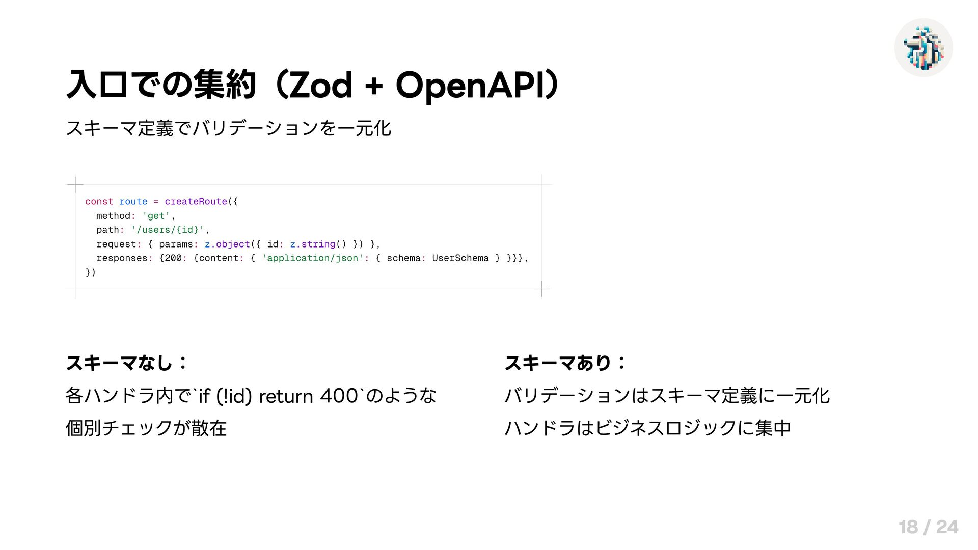 入口での集約(Zod + OpenAPI) スキーマ定義でバリデーションを一元化 スキーマなし: 各ハンドラ内で`if (!id) return 400`のような 個別チェックが散在
