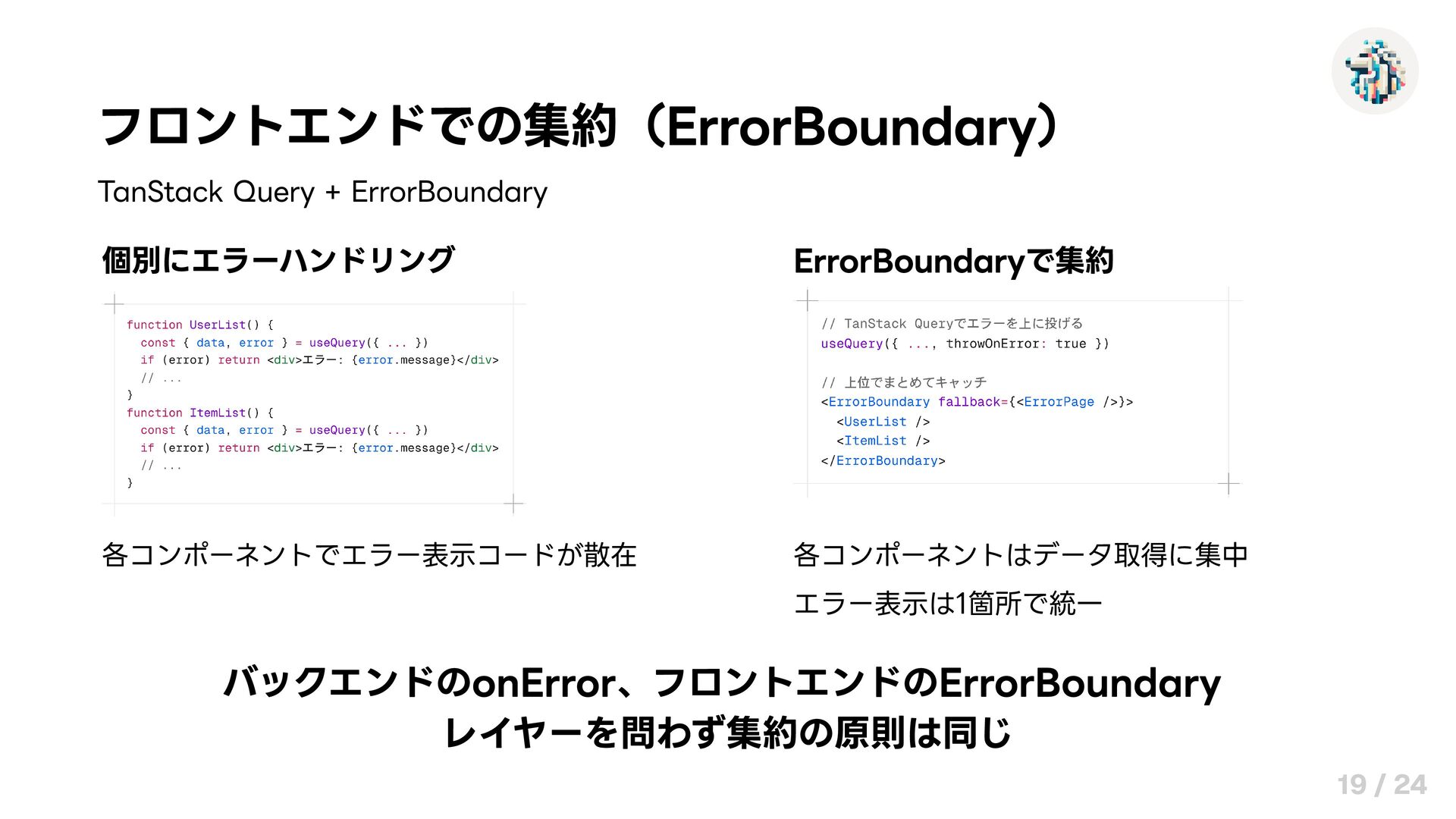フロントエンドでの集約(ErrorBoundary) TanStack Query + ErrorBoundary 個別にエラーハンドリング ErrorBoundaryで集約 各コンポーネントはデータ取得に集中 エラー表示は1箇所で統一 バックエンドのonError、フロントエンドのErrorBoundary