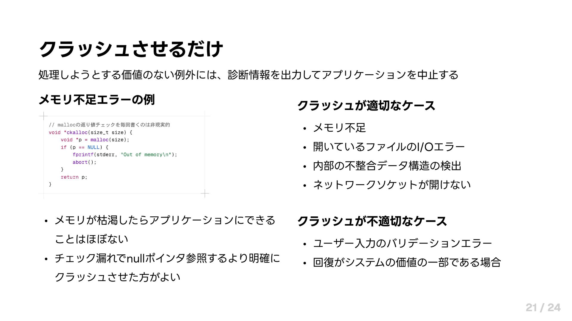 チェック漏れでnullポインタ参照するより明確に クラッシュさせた方がよい クラッシュが不適切なケース ユーザー入力のバリデーションエラー 回復がシステムの価値の一部である場合 21 / 24