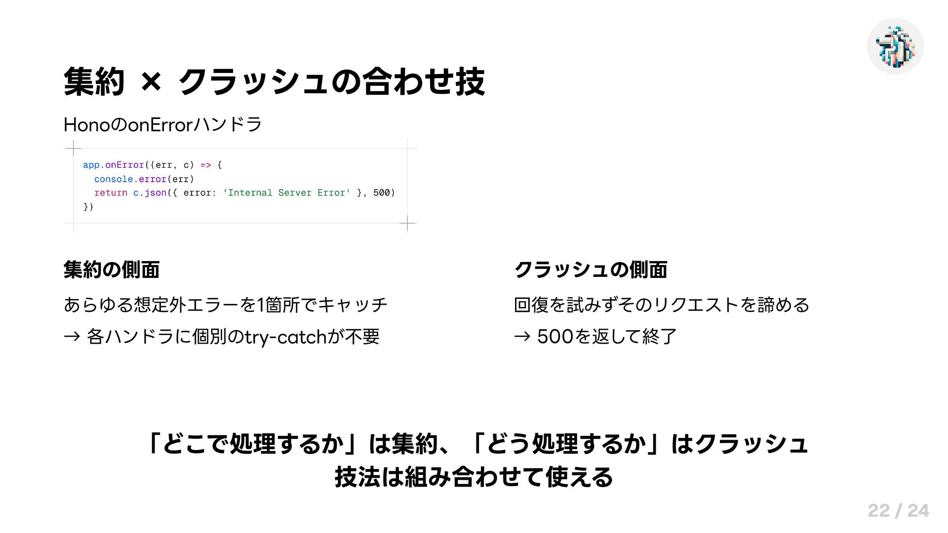 集約 × クラッシュの合わせ技 HonoのonErrorハンドラ 集約の側面 あらゆる想定外エラーを1箇所でキャッチ → 各ハンドラに個別のtry-catchが不要 クラッシュの側面 回復を試みずそのリクエストを諦める