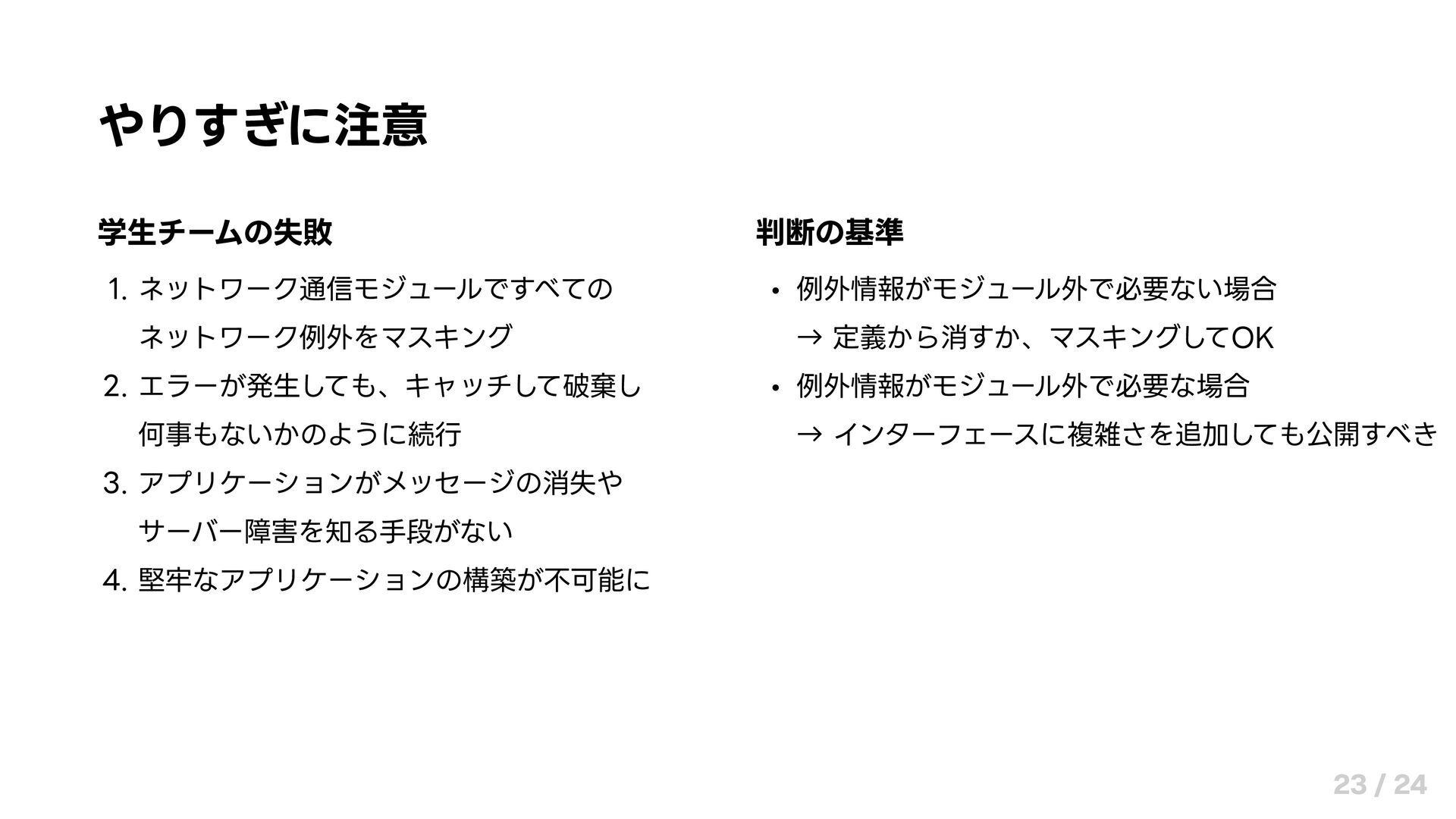 やりすぎに注意 学生チームの失敗 ネットワーク通信モジュールですべての ネットワーク例外をマスキング エラーが発生しても、キャッチして破棄し 何事もないかのように続行 アプリケーションがメッセージの消失や サーバー障害を知る手段がない 堅牢なアプリケーションの構築が不可能に 判断の基準
