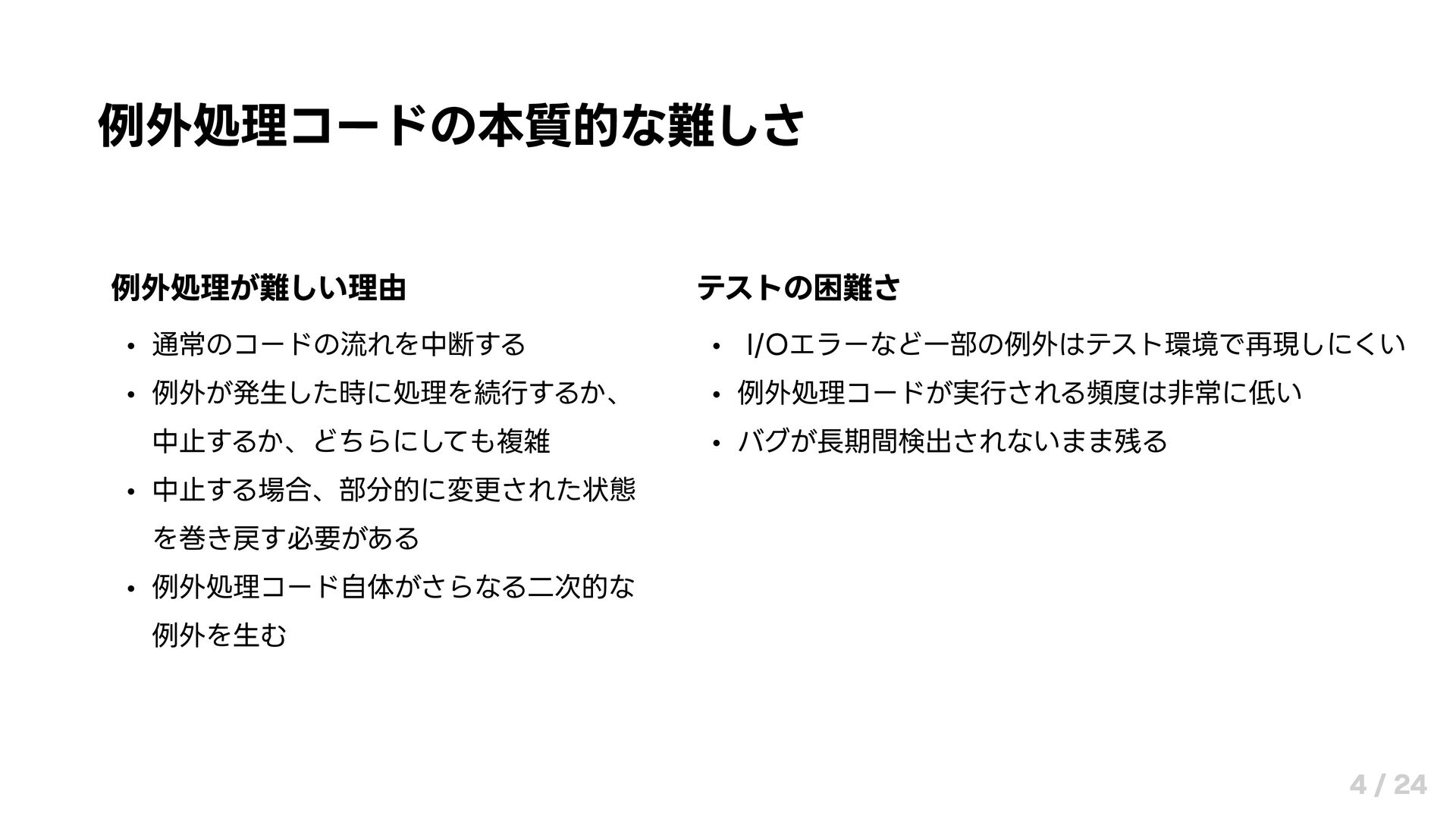 例外処理コードの本質的な難しさ 例外処理が難しい理由 テストの困難さ 通常のコードの流れを中断する 例外が発生した時に処理を続行するか、 中止するか、どちらにしても複雑 中止する場合、部分的に変更された状態 を巻き戻す必要がある 例外処理コード自体がさらなる二次的な 例外を生む