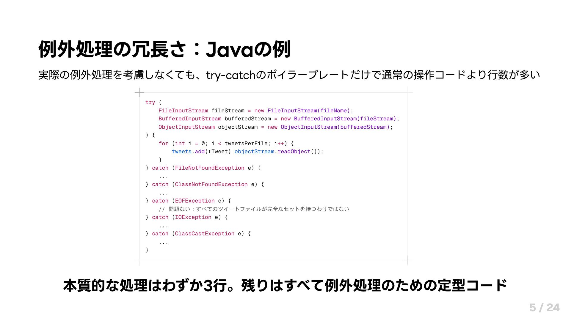 例外処理の冗長さ:Javaの例 実際の例外処理を考慮しなくても、try-catchのボイラープレートだけで通常の操作コードより行数が多い 本質的な処理はわずか3行。残りはすべて例外処理のための定型コード 5 / 24