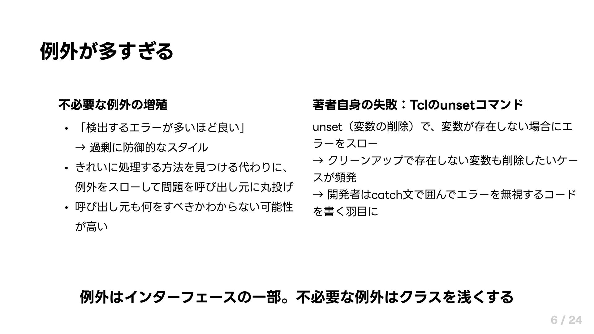 例外が多すぎる 不必要な例外の増殖 「検出するエラーが多いほど良い」 → 過剰に防御的なスタイル きれいに処理する方法を見つける代わりに、 例外をスローして問題を呼び出し元に丸投げ 呼び出し元も何をすべきかわからない可能性 が高い 著者自身の失敗:Tclのunsetコマンド