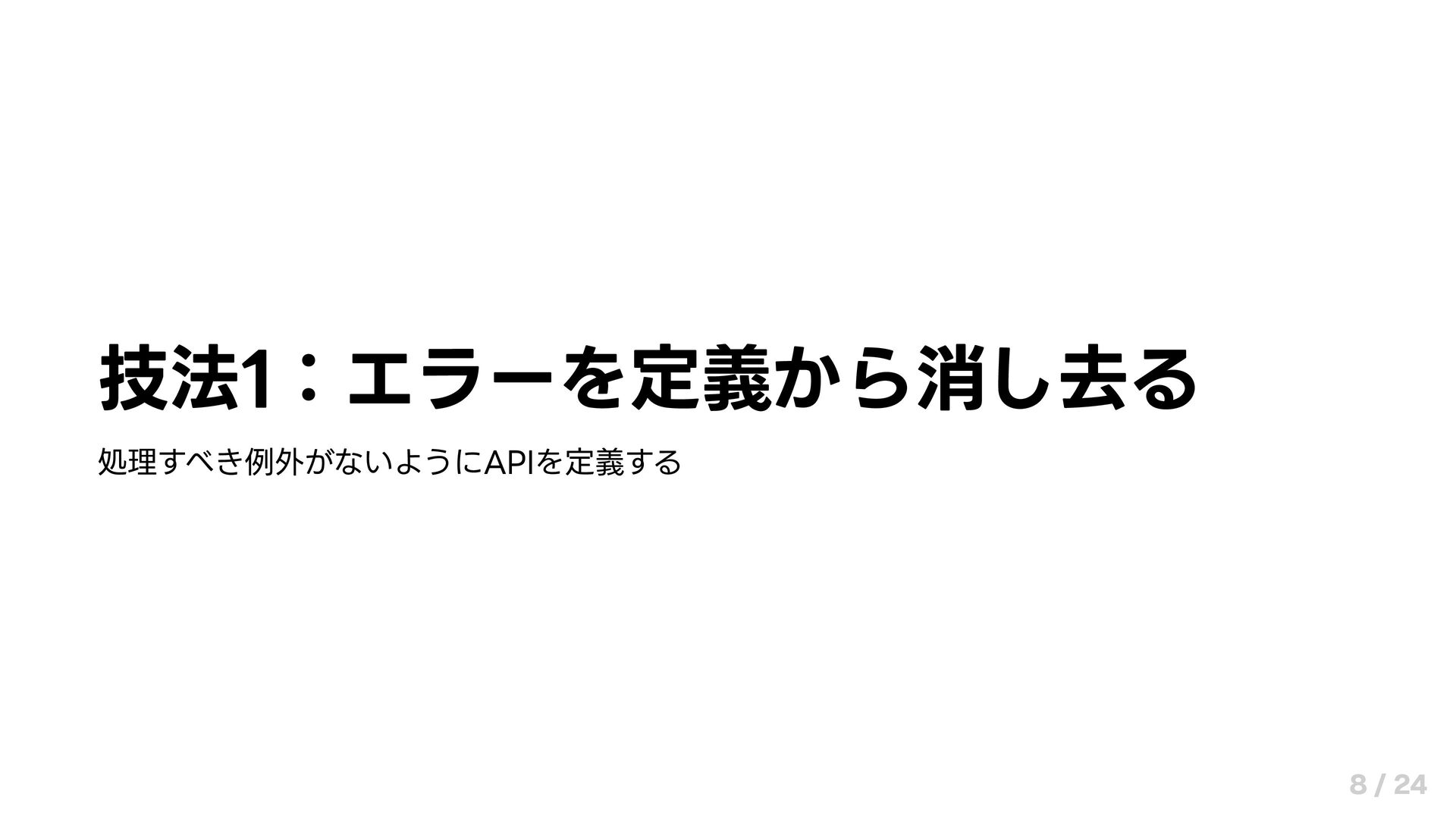 技法1:エラーを定義から消し去る 処理すべき例外がないようにAPIを定義する 8 / 24