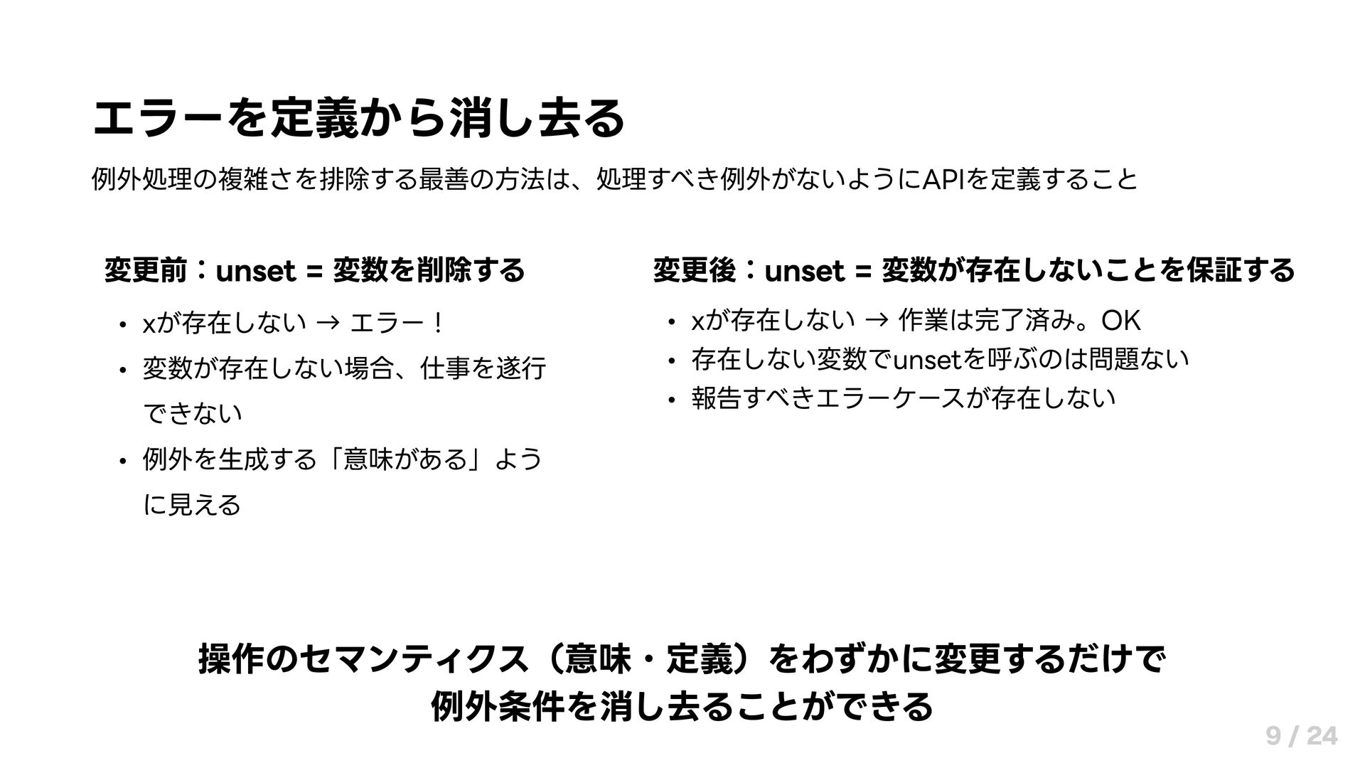 例外を生成する「意味がある」よう に見える 変更後:unset = 変数が存在しないことを保証する xが存在しない → 作業は完了済み。OK 存在しない変数でunsetを呼ぶのは問題ない 報告すべきエラーケースが存在しない 操作のセマンティクス(意味・定義)をわずかに変更するだけで 例外条件を消し去ることができる 9 / 24