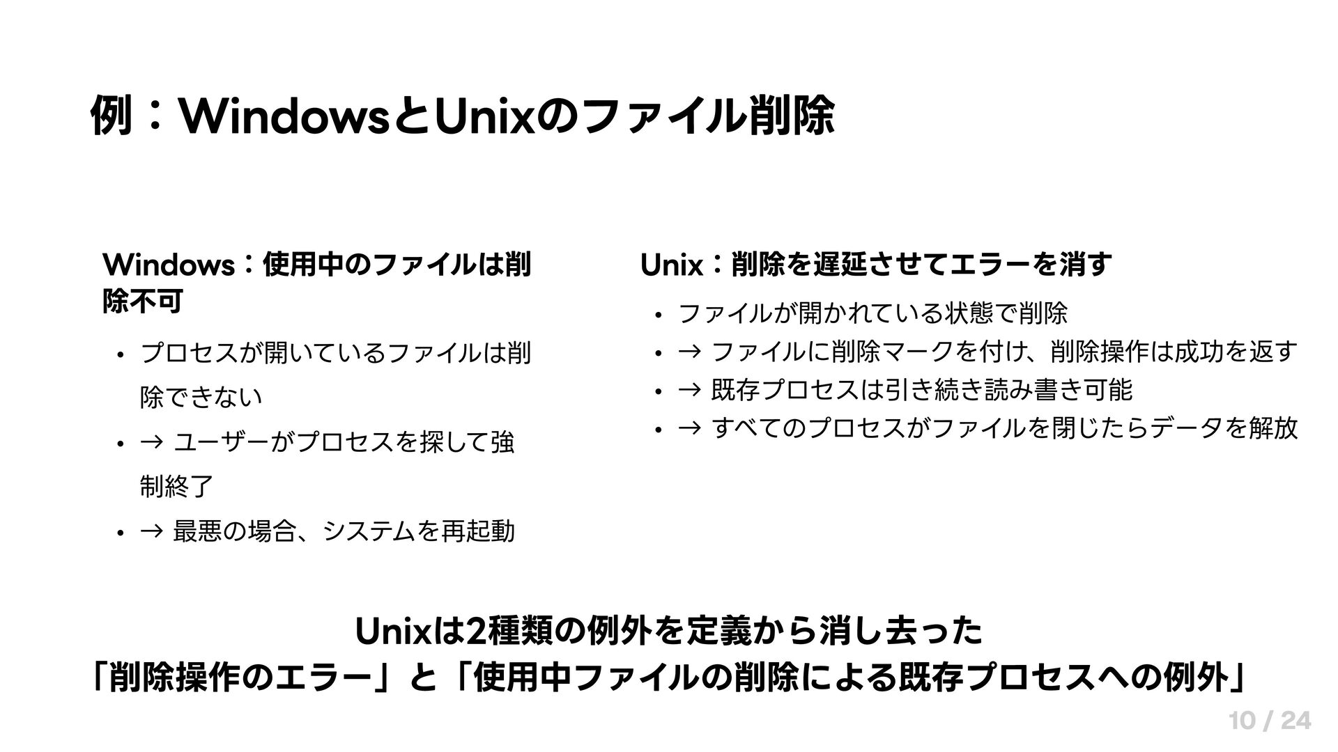 Unix:削除を遅延させてエラーを消す ファイルが開かれている状態で削除 → ファイルに削除マークを付け、削除操作は成功を返す → 既存プロセスは引き続き読み書き可能 → すべてのプロセスがファイルを閉じたらデータを解放 Unixは2種類の例外を定義から消し去った 「削除操作のエラー」と「使用中ファイルの削除による既存プロセスへの例外」 10 / 24