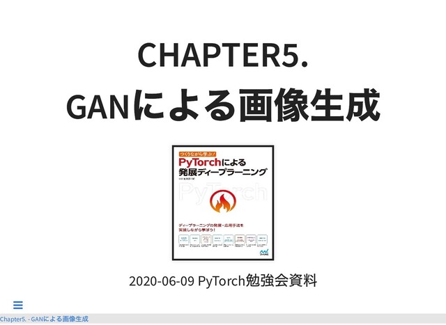 Descriminator( 判定者 ) が互いを利⽤しなが ら学習し合う G は何かを⽣成 >> D は G の⽬標となる正解と G の⽣成物に 対して真贋判定 結果を元に G,D の重み更新 うまく⾏くと何かを⽣み出す Generator が⼿に⼊る ⾔うは易しだがバランス取るのが⼤変で、⽬的を達成するた めに G や D に様々なアイデアを投⼊する Chapter5. - GAN による画像⽣成