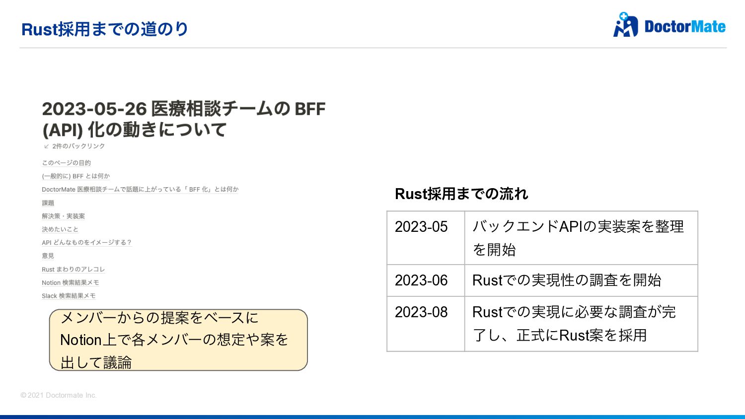 © Doctormate Inc. Rust࠾༻·ͰͷಓͷΓ © 2021 Doctormate Inc. ϝϯόʔ͔ΒͷఏҊΛϕʔεʹ Notion্Ͱ֤ϝϯόʔͷఆҊΛ