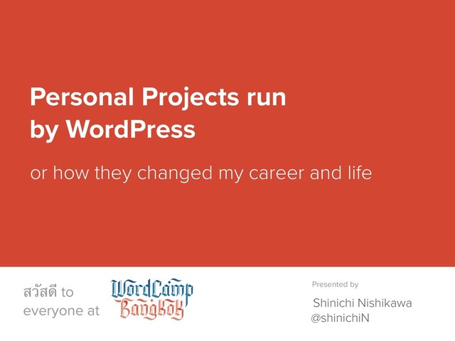 A talk by Shinichi Nishikawa about small projects he runs with his family and friends. Those are parenting blog platform, WordPress community news media, personal podcasts, multiple WordCamps and meetups in Tokyo, Bangkok, and Ogi island I live with 150 people.