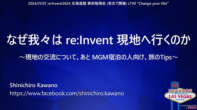 #reinventhokkaido なぜ我々は re:Invent 現地へ行くのか ~現地の交流について、あと MGM宿泊の人向け、旅のTips~ Shinichiro Kawano https://www.facebook.com/shinichiro.kawano 2024/11/07