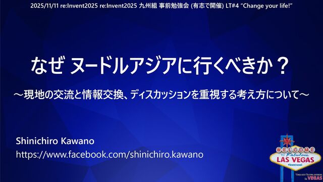 #reinventkyushu なぜ ヌードルアジアに行くべきか? ~現地の交流と情報交換、ディスカッションを重視する考え方について~ Shinichiro Kawano https://www.facebook.com/shinichiro.kawano 2025/11/11 re:Invent2025 re:Invent2025