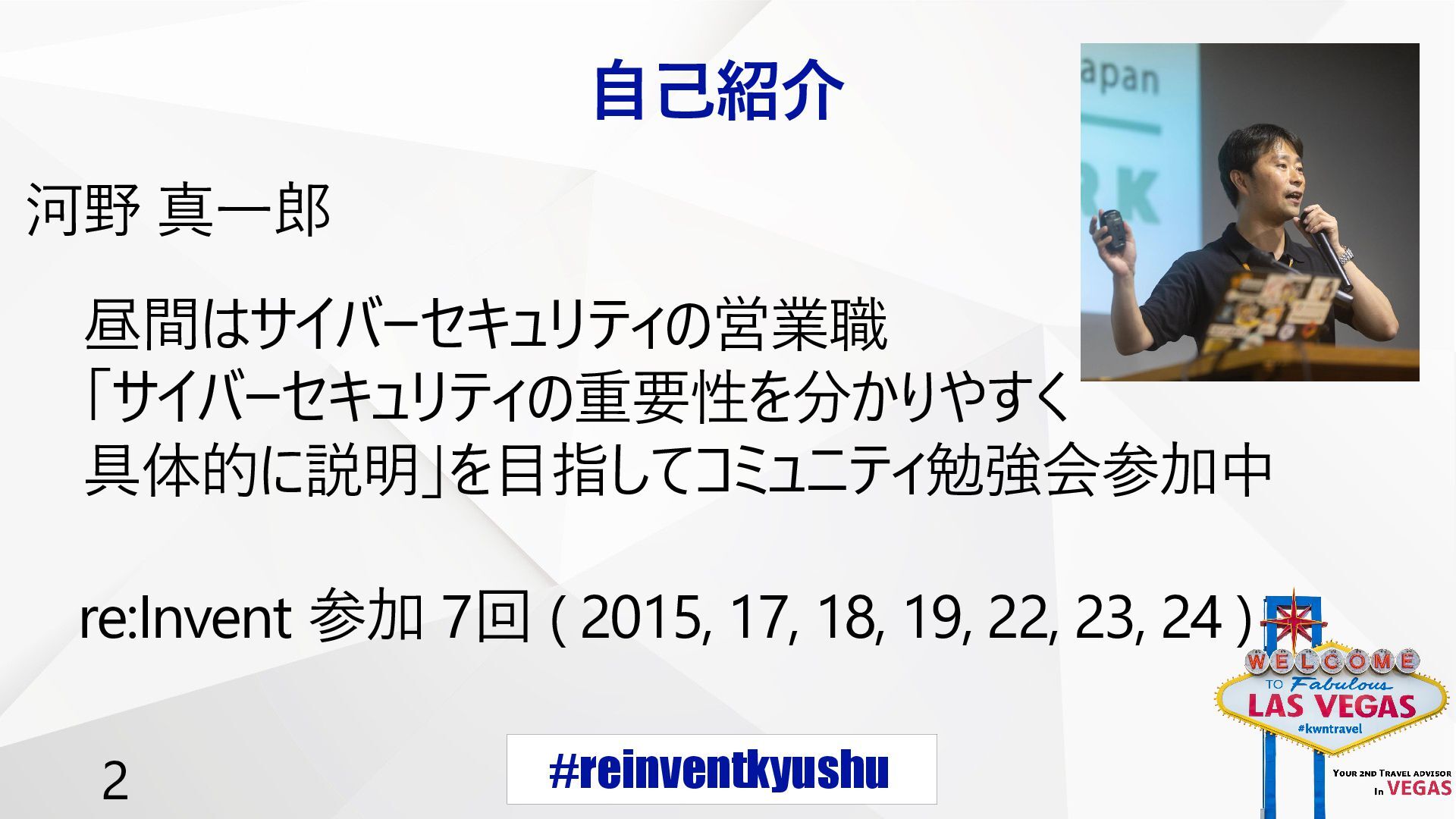 #reinventkyushu 2 自己紹介 河野 真一郎 昼間はサイバーセキュリティの営業職 「サイバーセキュリティの重要性を分かりやすく 具体的に説明」を目指してコミュニティ勉強会参加中 re:Invent 参加