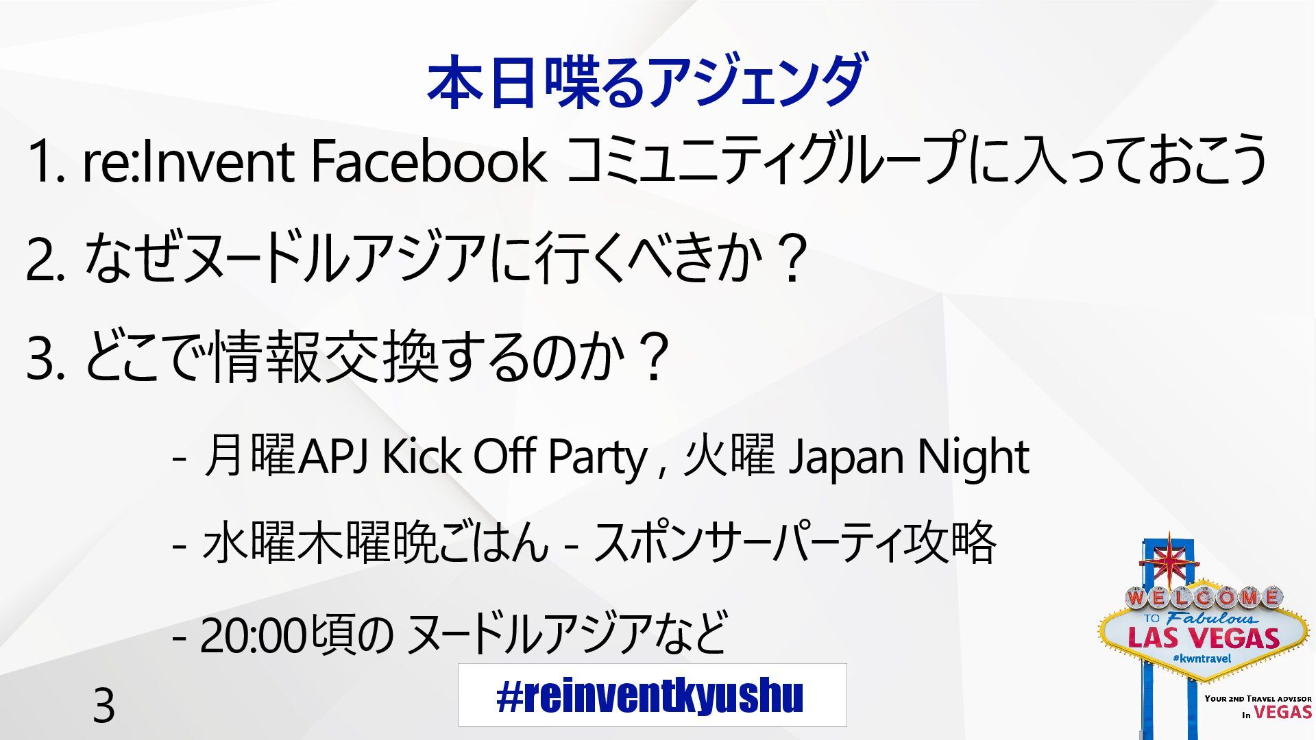 #reinventkyushu 3 本日喋るアジェンダ 1. re:Invent Facebook コミュニティグループに入っておこう 2. なぜヌードルアジアに行くべきか? 3.