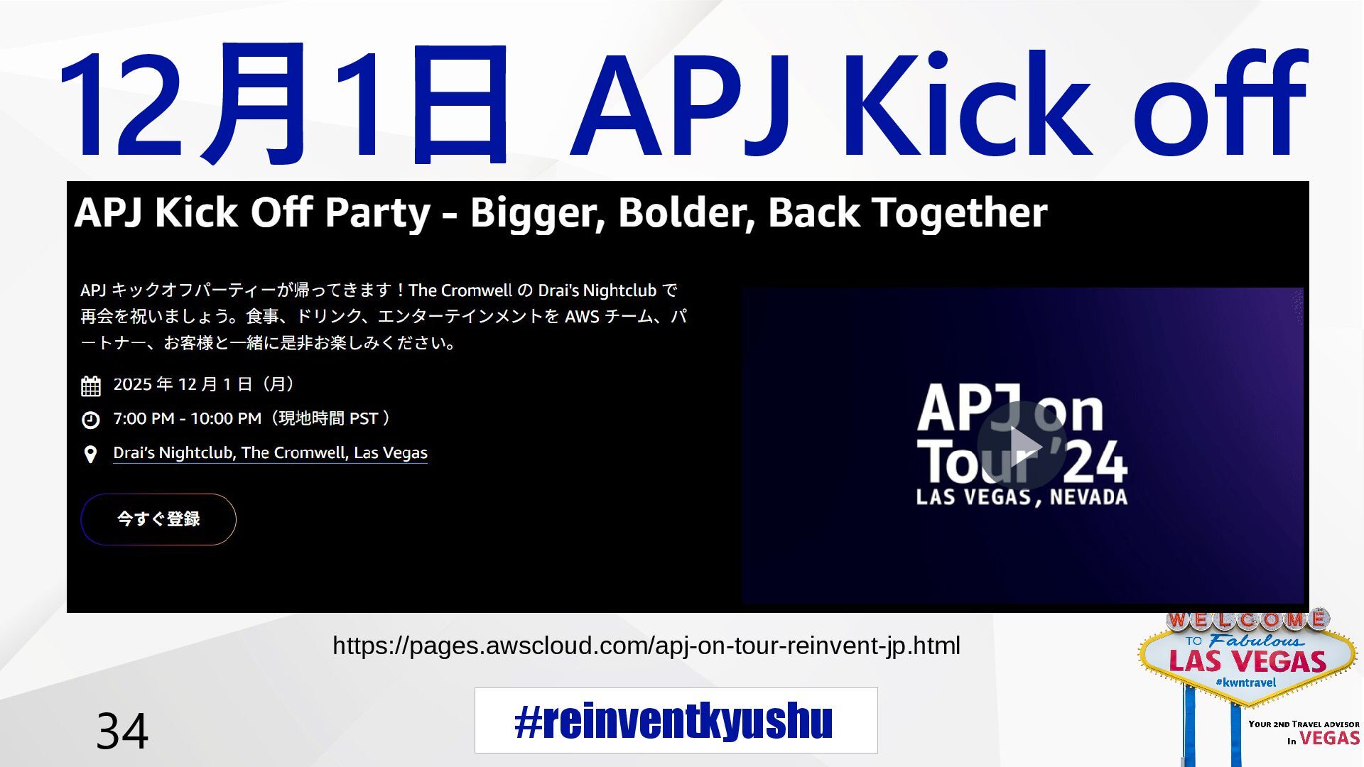 #reinventkyushu 34 12月1日 APJ Kick off https://pages.awscloud.com/apj-on-tour-reinvent-jp.html