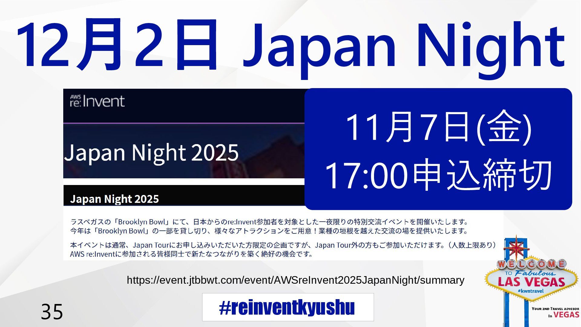 #reinventkyushu 35 12月2日 Japan Night https://event.jtbbwt.com/event/AWSreInvent2025JapanNight/summary 11月7日(金) 17:00申込締切