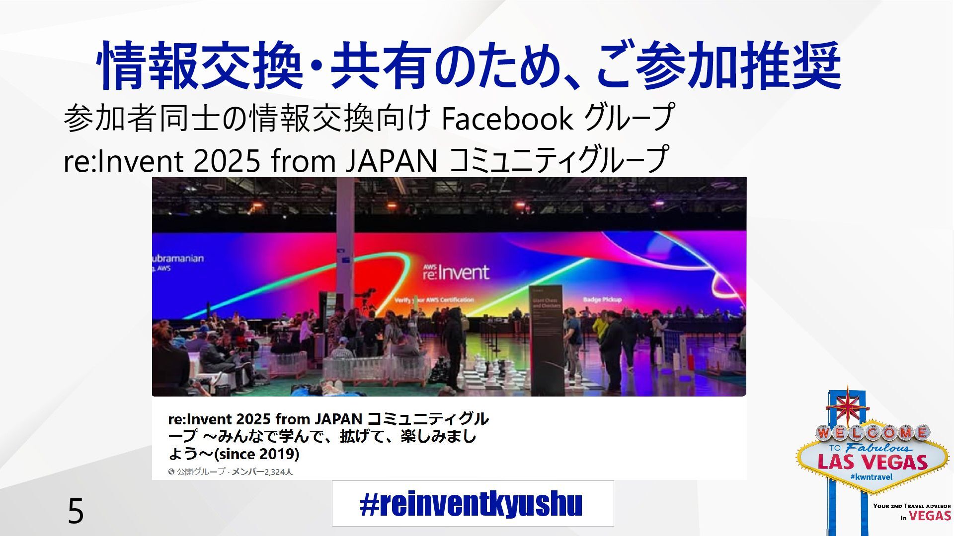 #reinventkyushu 5 情報交換・共有のため、ご参加推奨 参加者同士の情報交換向け Facebook グループ re:Invent 2025 from JAPAN