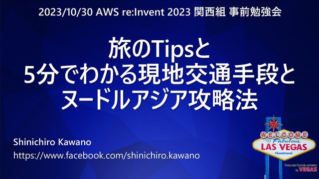 #reinventkansai 旅のTipsと 5分でわかる現地交通手段と ヌードルアジア攻略法 Shinichiro Kawano https://www.facebook.com/shinichiro.kawano 2023/10/30 AWS re:Invent