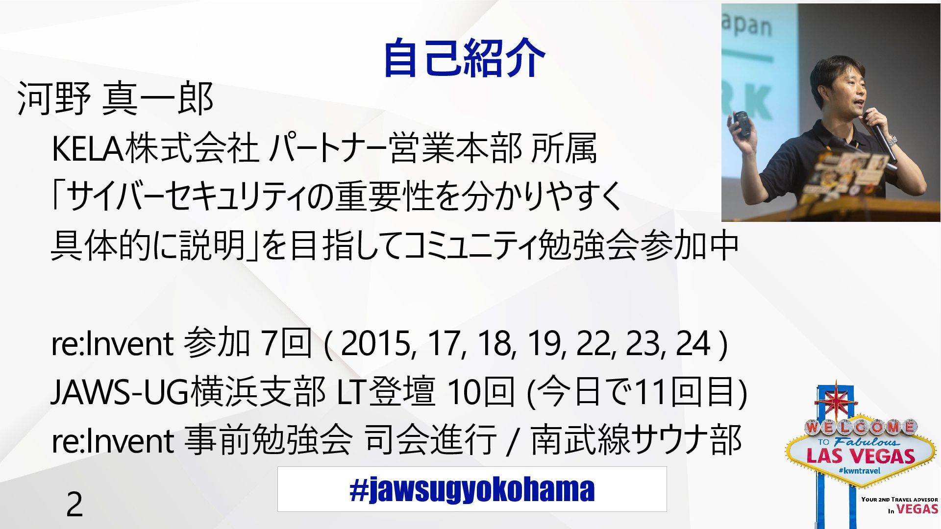 #jawsugyokohama 2 自己紹介 河野 真一郎 KELA株式会社 パートナー営業本部 所属 「サイバーセキュリティの重要性を分かりやすく 具体的に説明」を目指してコミュニティ勉強会参加中
