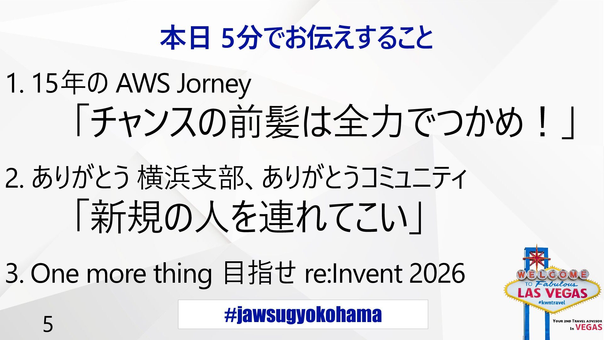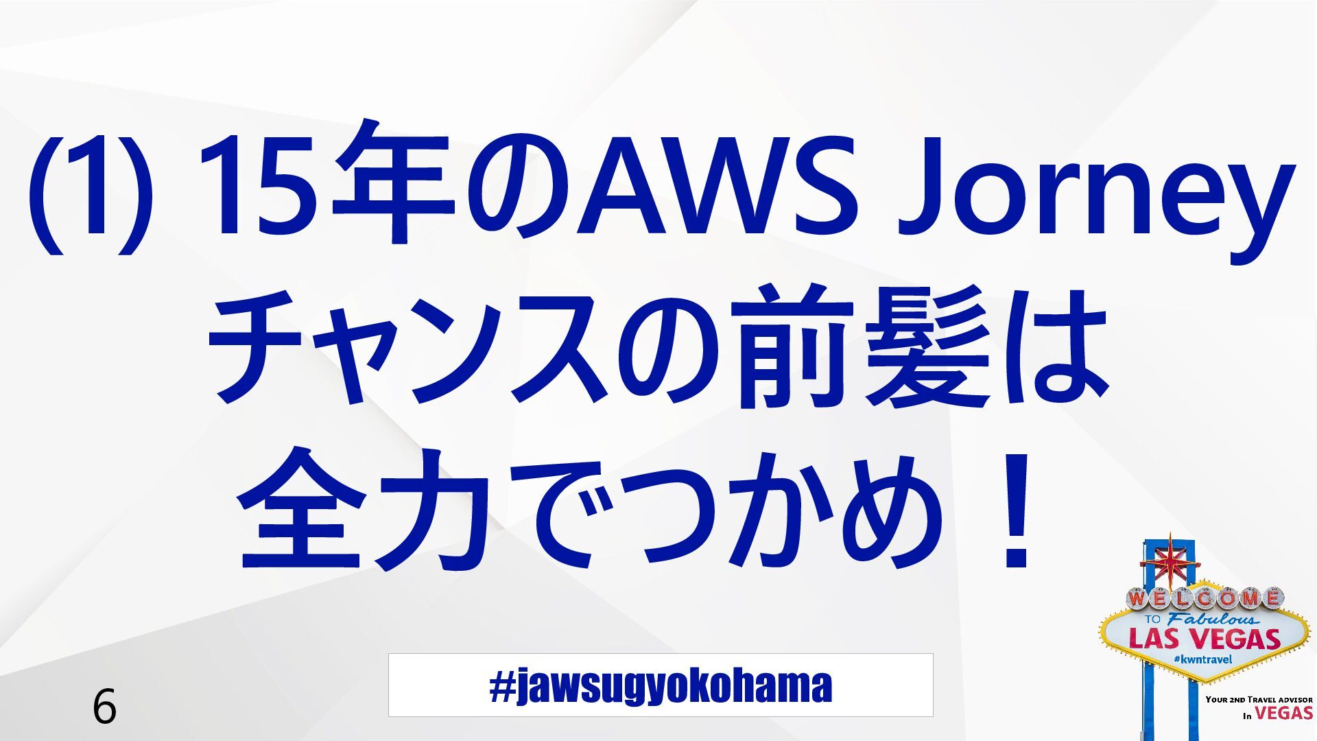 #jawsugyokohama 5 本日 5分でお伝えすること 1. 15年の AWS Journey 「チャンスの前髪は全力でつかめ!」