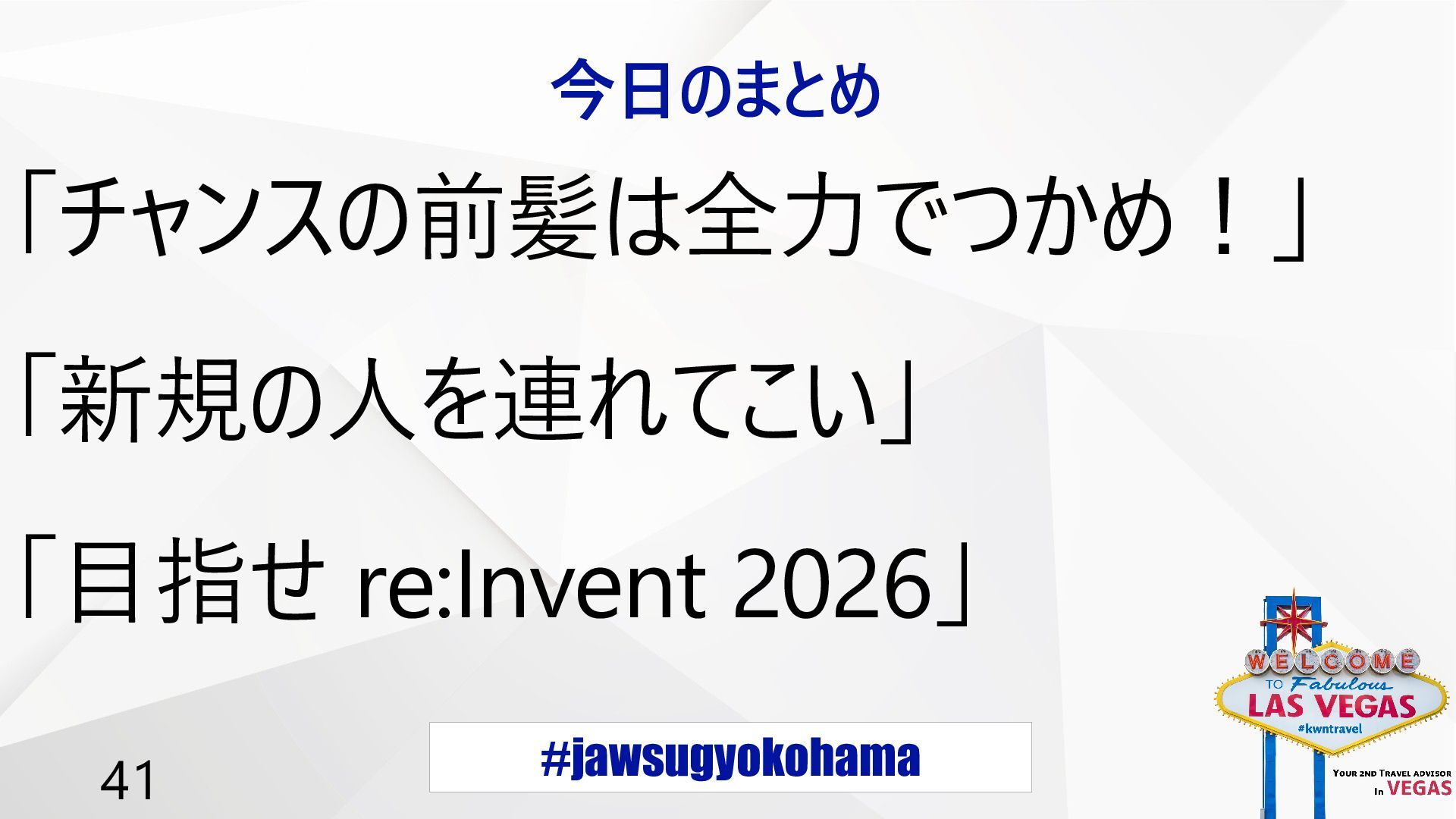 #jawsugyokohama 42 今日のまとめ 「チャンスの前髪は全力でつかめ!」 「新規の人を連れてこい」 「目指せ re:Invent 2026」