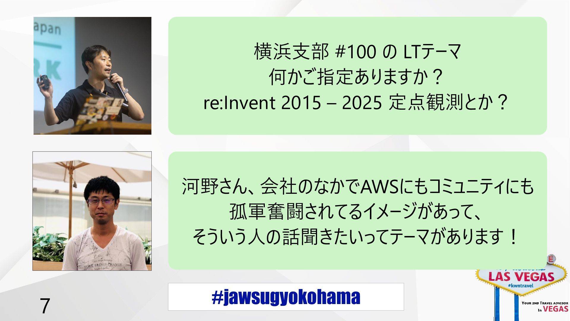 #jawsugyokohama 7 横浜支部 #100 の LTテーマ 何かご指定ありますか? re:Invent 2015 –