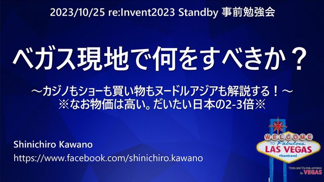 #reInvent2023stby ベガス現地で何をすべきか? ~カジノもショーも買い物もヌードルアジアも解説する!~ ※なお物価は高い。だいたい日本の2-3倍※ Shinichiro Kawano https://www.facebook.com/shinichiro.kawano 2023/10/25 re:Invent2023 Standby