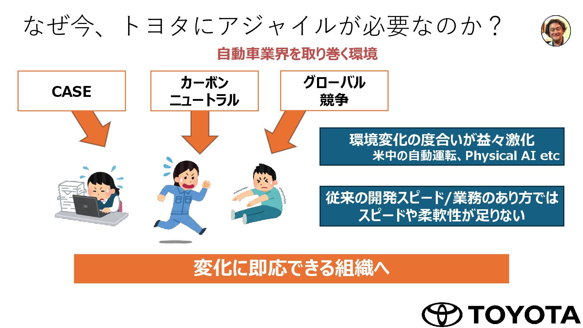 1. なぜ今、トヨタにアジャイルが必要なのか? CASE カーボン ニュートラル グローバル 競争 環境変化の度合いが益々激化 米中の自動運転、Physical AI etc