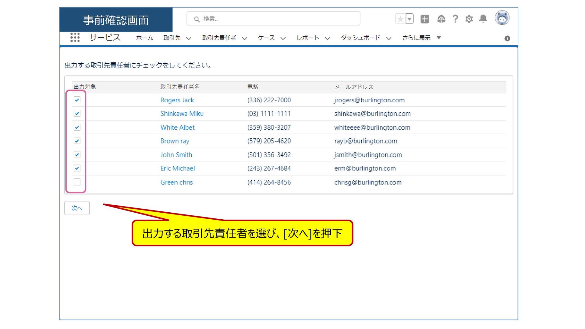 出力する取引先責任者を選び、[次へ]を押下 事前確認画面