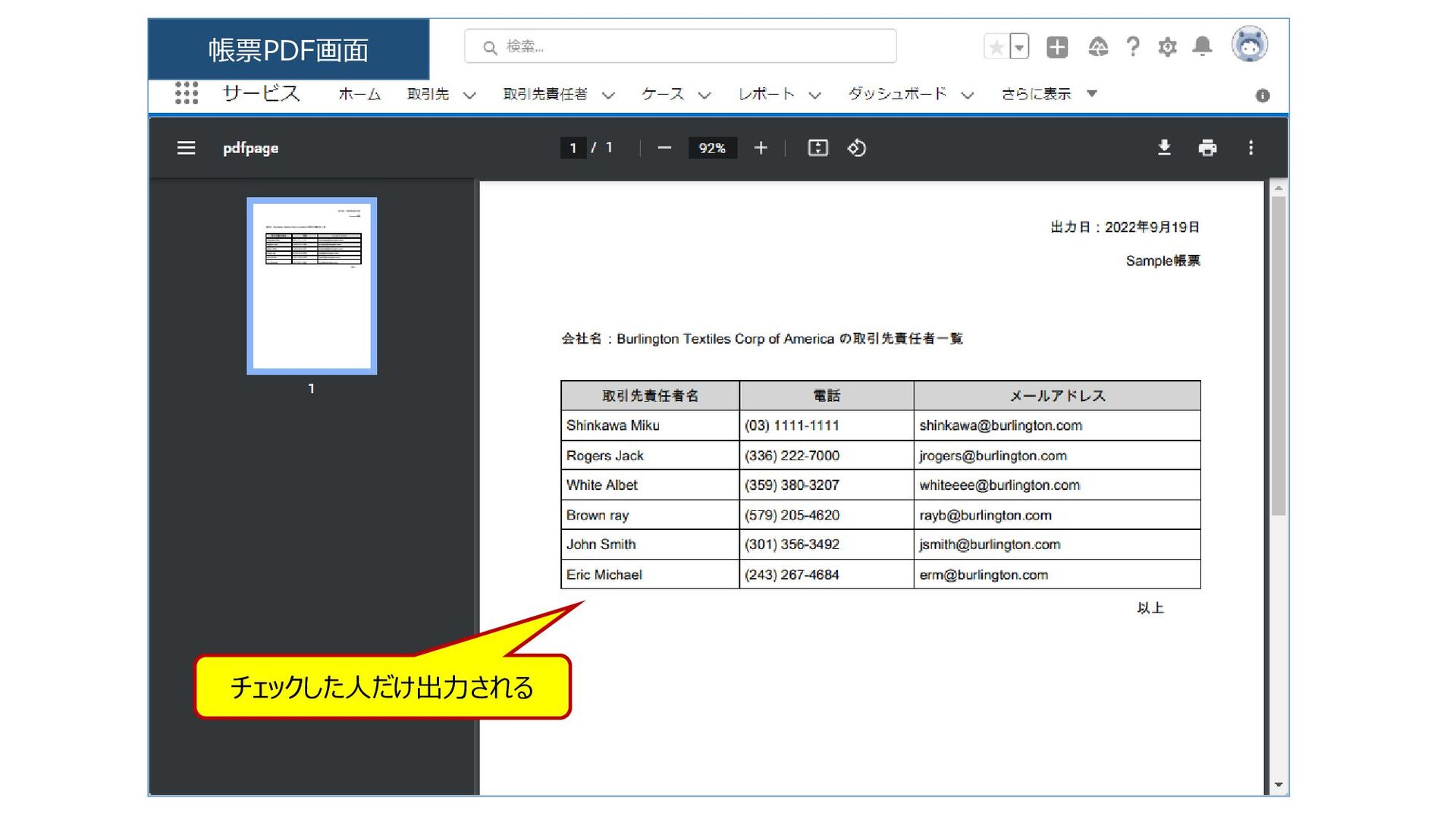 チェックした人だけ出力される 帳票PDF画面
