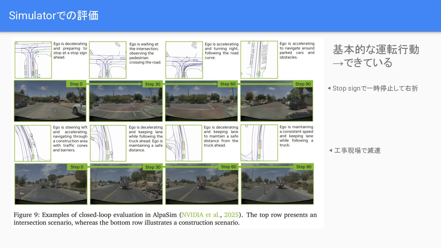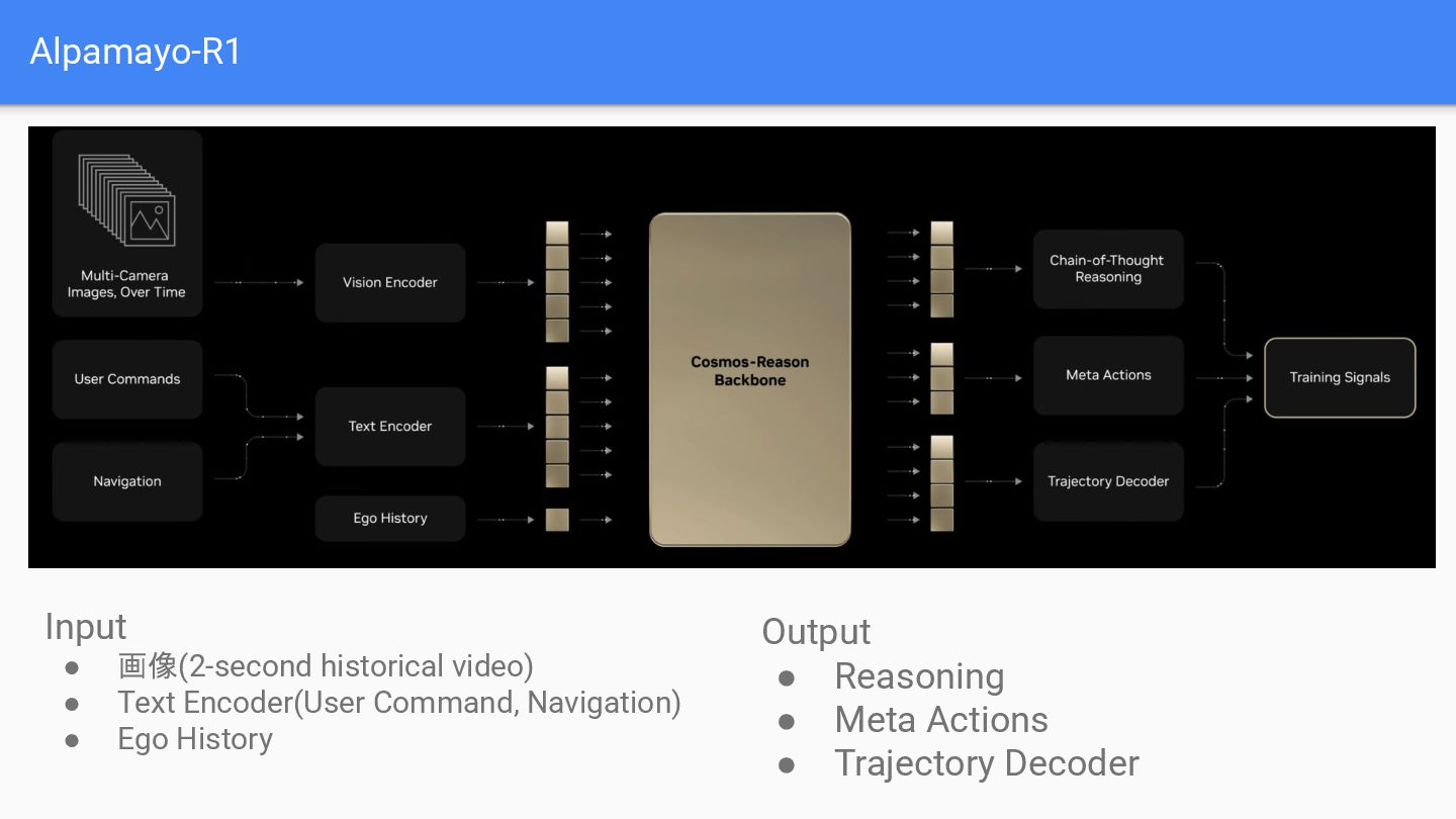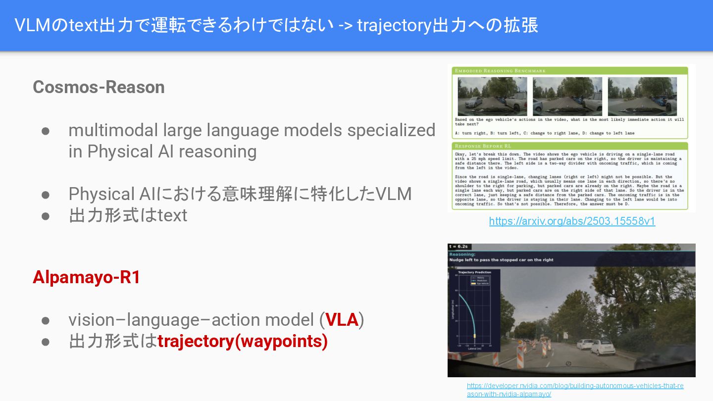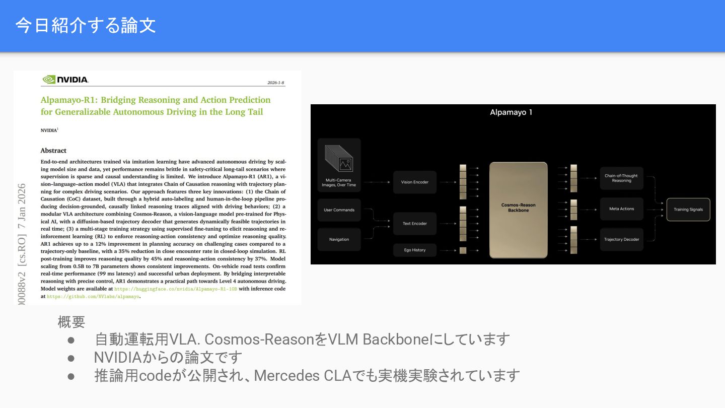 Cosmos-Reasonをbackboneとして用いるVLA自動運転モデルについての発表です。
