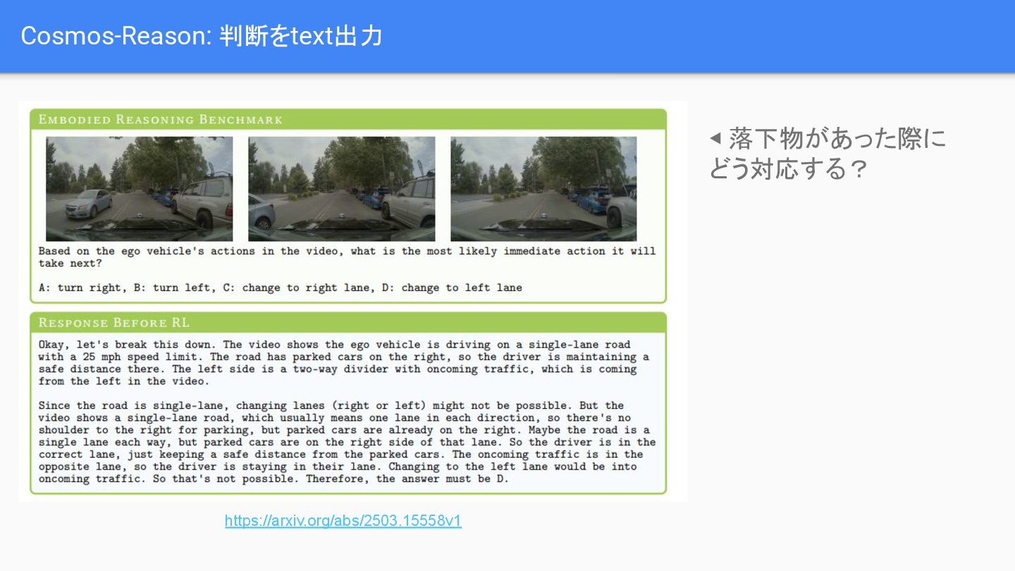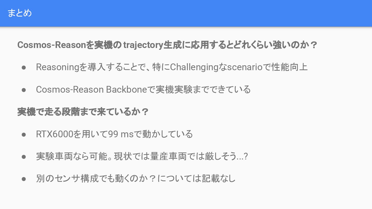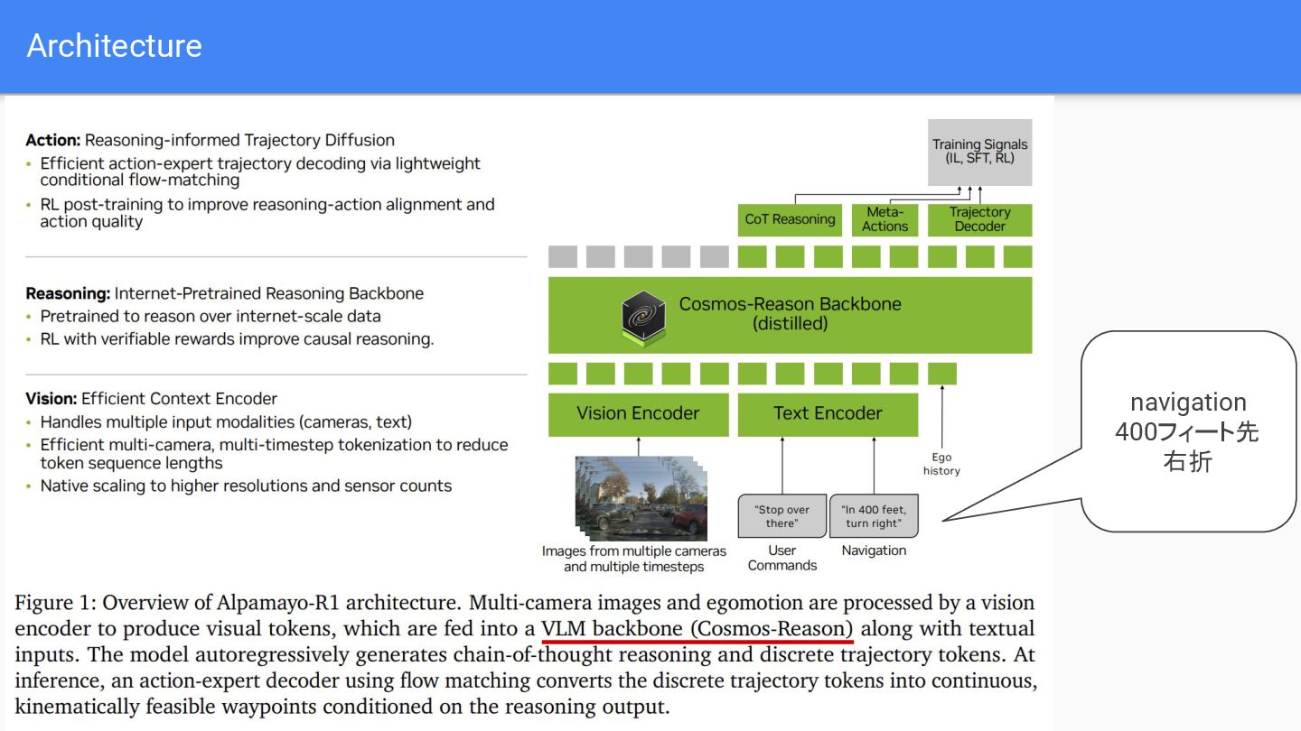 Cosmos-Reasonをbackboneとして用いるVLA自動運転モデルについての発表です。