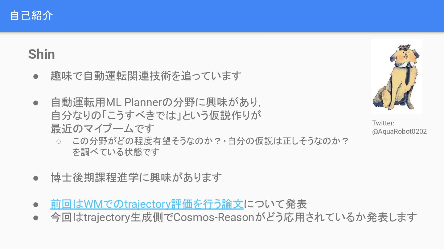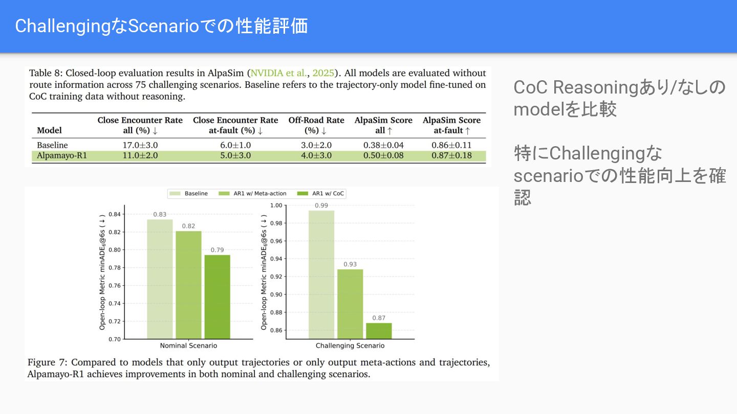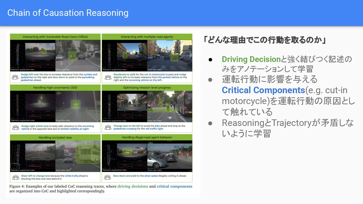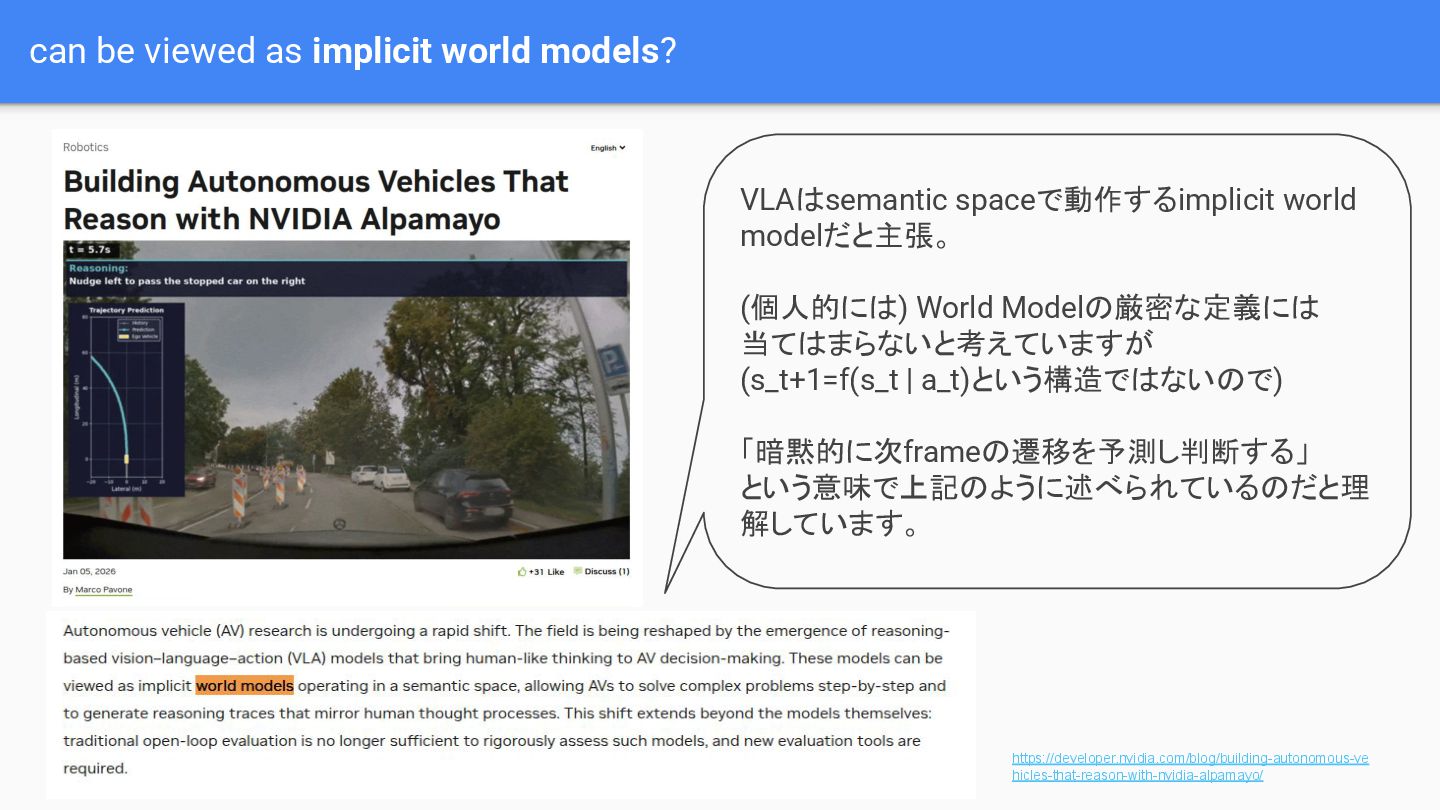 Cosmos-Reasonをbackboneとして用いるVLA自動運転モデルについての発表です。