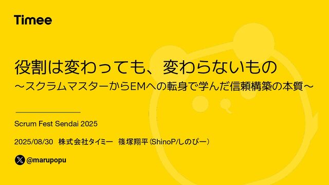 Scrum Fest Sendai 2025 2025/08/30 株式会社タイミー 篠塚翔平(ShinoP/しのぴー) 役割は変わっても、変わらないもの 〜スクラムマスターからEMへの転身で学んだ信頼構築の本質〜 @marupopu