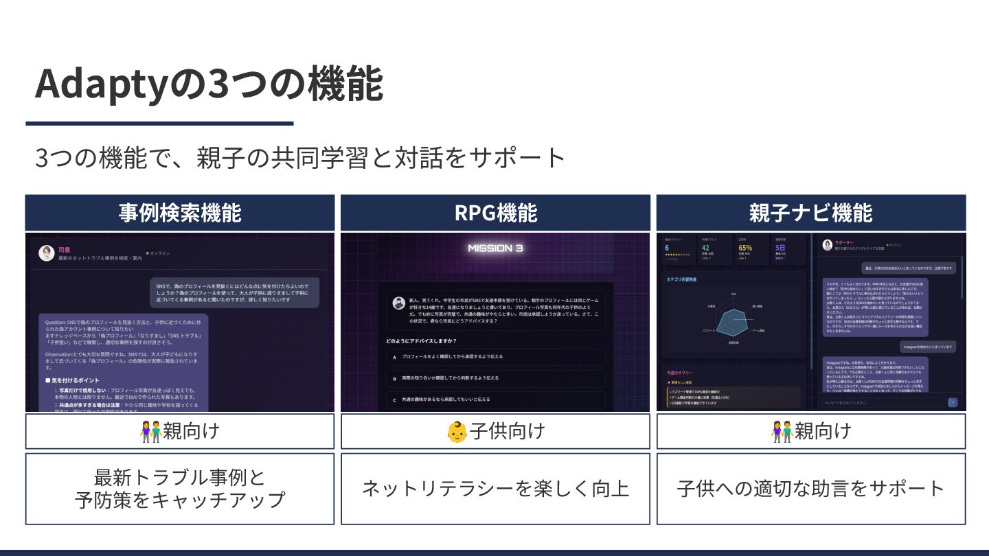 Adaptyの3つの機能 3つの機能で、親⼦の共同学習と対話をサポート 事例検索機能 最新トラブル事例と 予防策をキャッチアップ RPG機能 ネットリテラシーを楽しく向上 親⼦ナビ機能 ⼦供への適切な助⾔をサポート 👫親向け